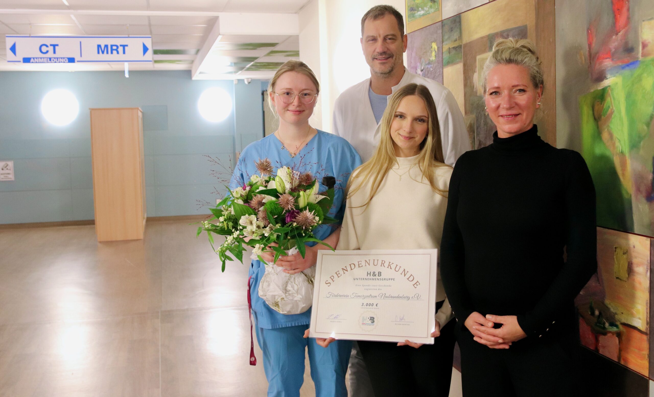 Bild unten: Doreen Vierow (von rechts) und Ilaine Lux von der H & B Unternehmensgruppe übergaben die Spende an Dr. med. Sascha Alexander Pietruschka und Anne-Christin Raap vom Förderverein Tumorzentrum e. V..