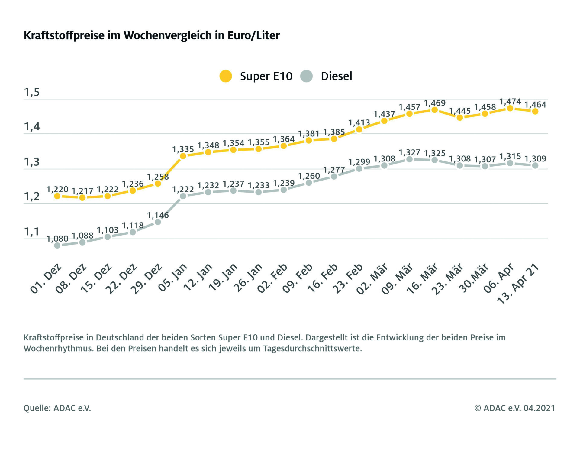 Einen leichten Rückgang der Kraftstoffpreise ermittelt der ADAC in seiner wöchentlichen Auswertung. Demnach kostet ein Liter Super E10 im Bundesschnitt 1,464 Euro, Diesel 1,309 Euro. Somit ist Super E10 exakt 1 Cent, Diesel 0,6 Cent günstiger als in der Vorwoche.