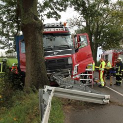 Bei einem Unfall zwischen der Kreuzung B 198 und Röbel ist heute Nachmittag ein 32 Jahre alter Lasterfahrer schwer verletzt worden. Er befuhr mit seinem Lkw mit Sattel-Auflieger die L 241 aus Richtung B198 kommend in Richtung Röbel. Ca. 400 Meter vor Röbel kam er nach dem Durchfahren einer Linkskurve nach rechts von der Fahrbahn ab und fuhr gegen einen Straßenbaum. Der Lkw-Fahrer wurde im Führerhaus eingeklemmt und musste durch Kräfte der Freiwilligen Feuerwehr Röbel befreit werden.