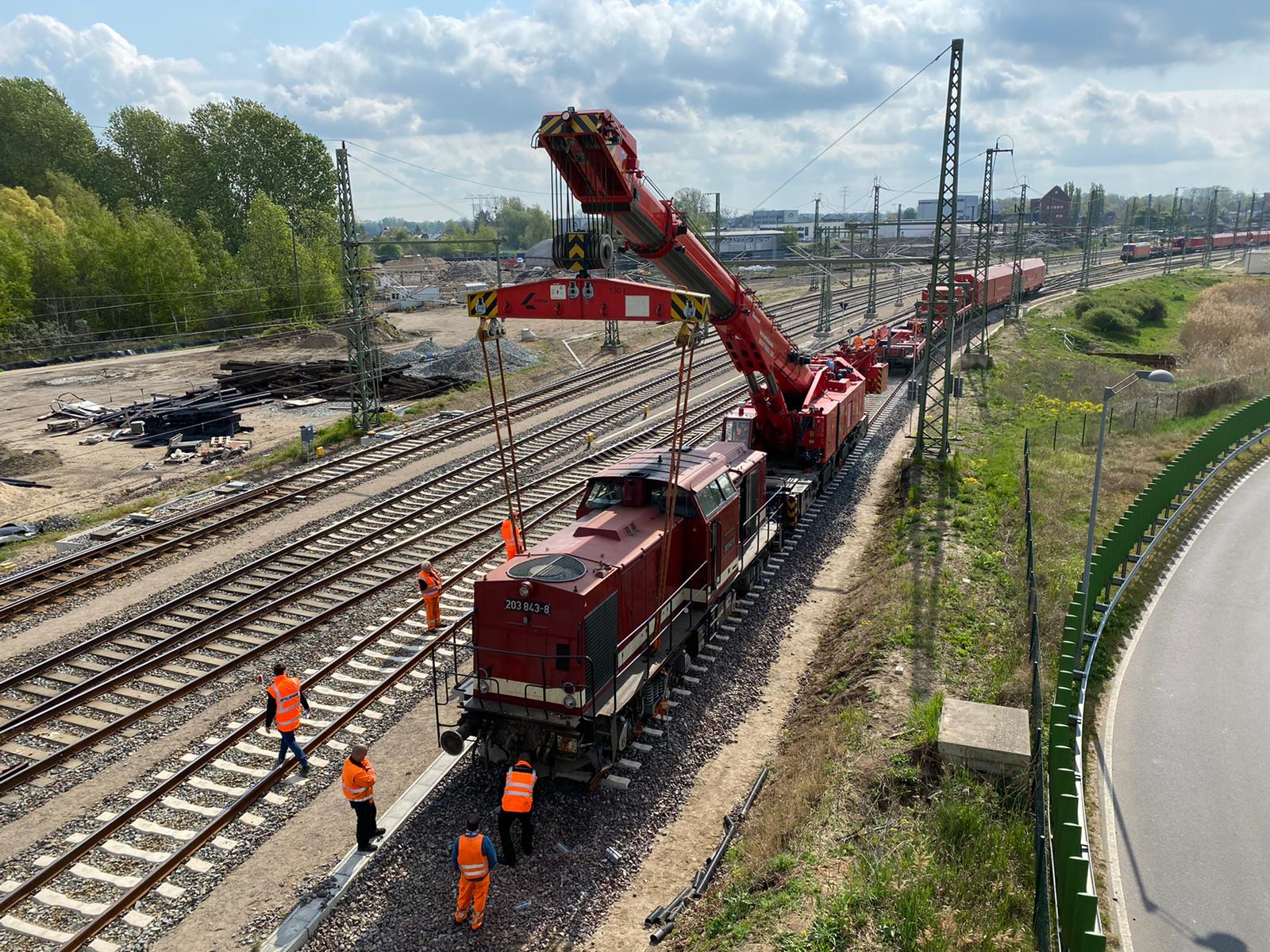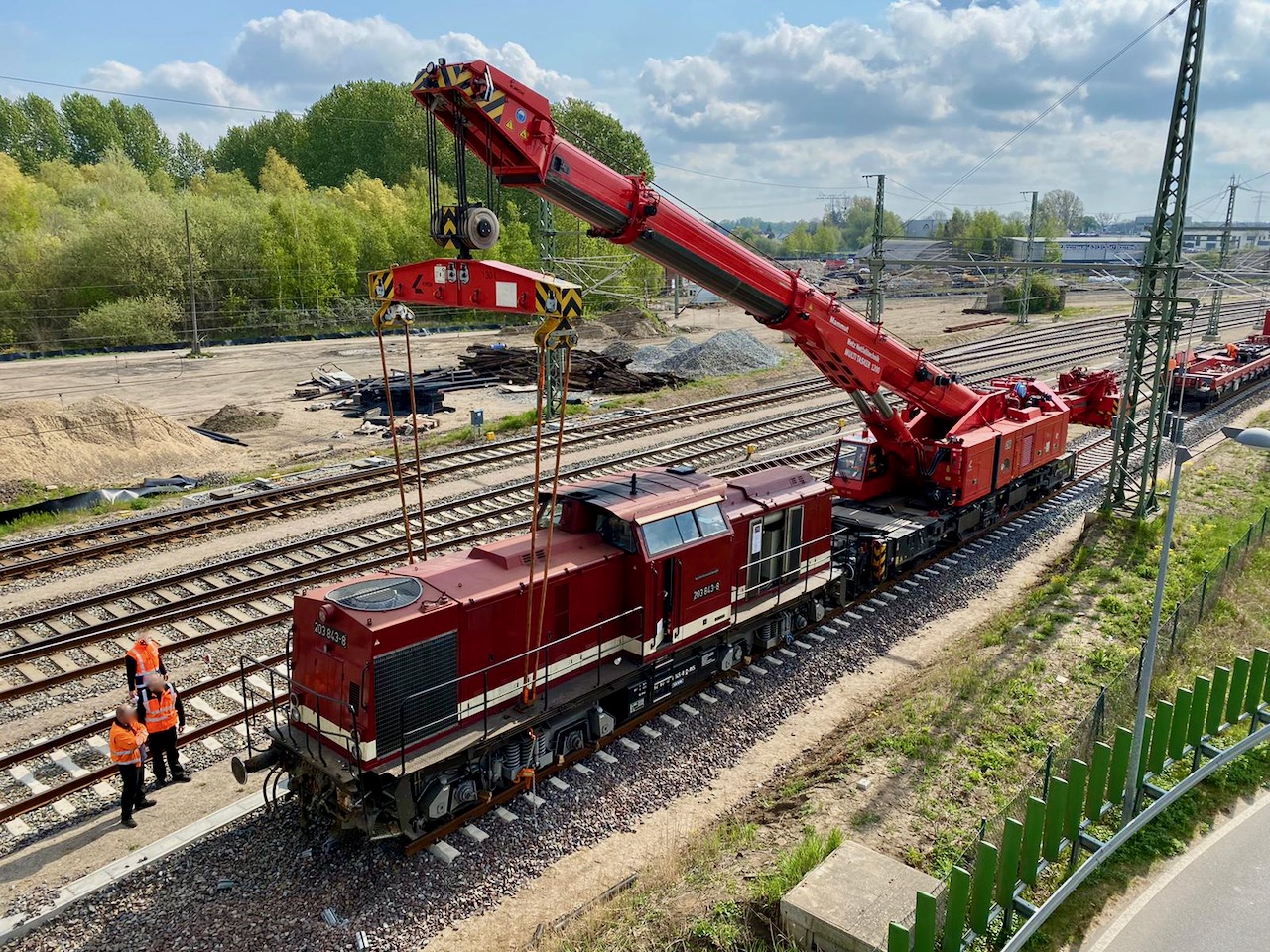 Die Lok, die am Donnerstagabend im Bereich der Teterower Straße übers Ziel hinaus geschossen ist (WsM berichtete) wurde heute Vormittag wieder in die Spur gebracht. Ein ziemlich aufwändiger Prozess. Die Lok hatte am Donnerstag Schwellen im Gepäck, als das Malheur passierte.