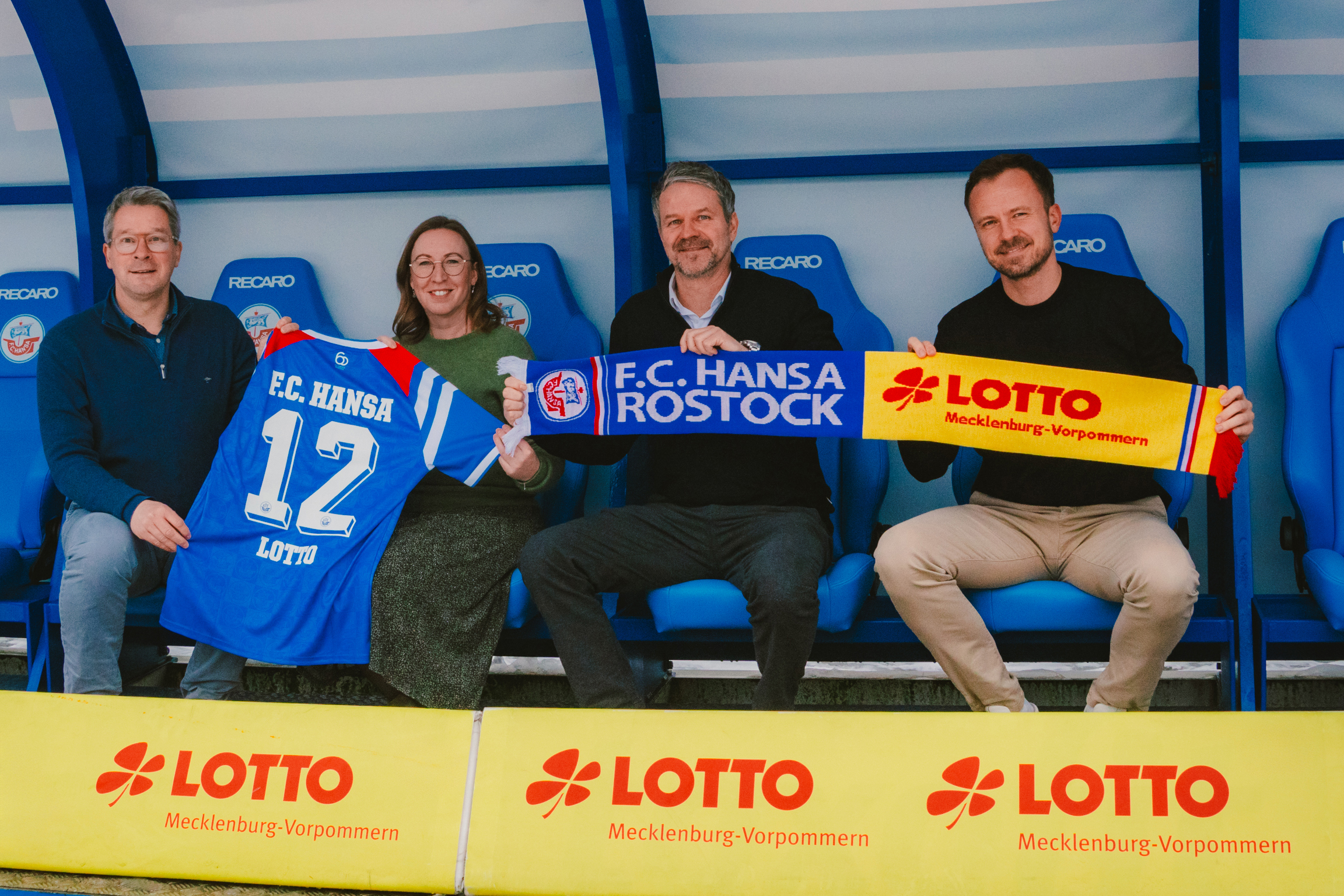 Bild: Ronald Maul (Vorstandsvorsitzender FCH), Elisabeth Aßmann (Geschäftsführerin LOTTO MV), Mathias Lesniewski (Gruppenleiter Vertrieb LOTTO MV) und Martin Grunert (Direktor B2B FCH) auf der Trainer- und Spielerbank im Ostseestadion.