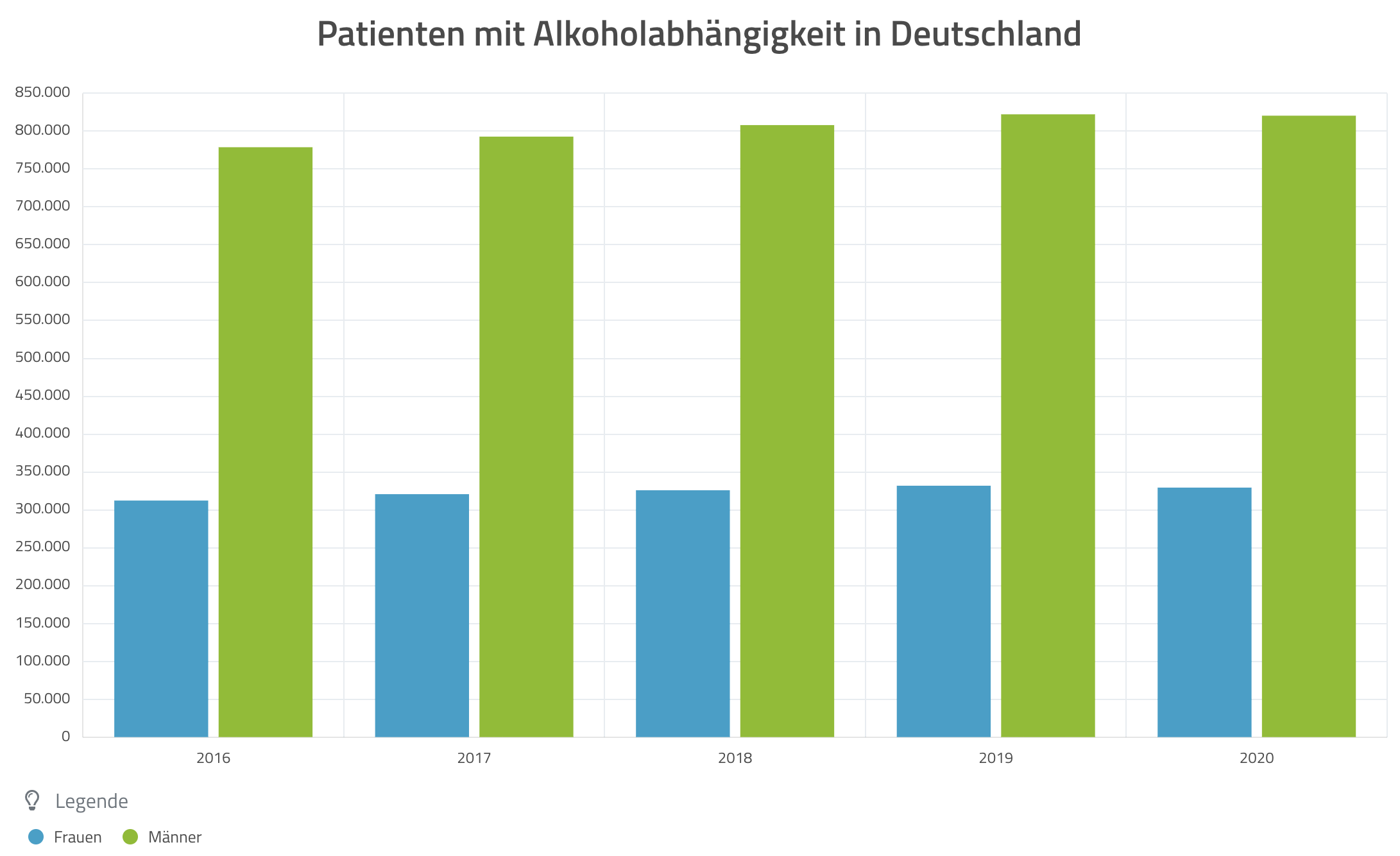 Auch wenn derzeit im Land sehr viel mehr Männer als Frauen betroffen sind, scheint die Alkoholsucht weiblicher zu werden: So ist der Anteil der alkoholkranken Männer von 2016 bis zum Jahr 2020 um etwa 4,2 Prozent gestiegen, während bei den Frauen im selben Zeitraum ein Zuwachs von rund 6,6 Prozent festgestellt wurde. Im Vergleich der Bundesländer nimmt Mecklenburg-Vorpommern einen traurigen Spitzenplatz ein: Mit einer Rate von 21 Betroffenen je 1.000 Personen gibt es hierzulande über 50 Prozent mehr Alkoholkranke als im Bundesschnitt. Nur in Bremen liegt die Rate mit 22 je 1.000 Personen etwas höher.