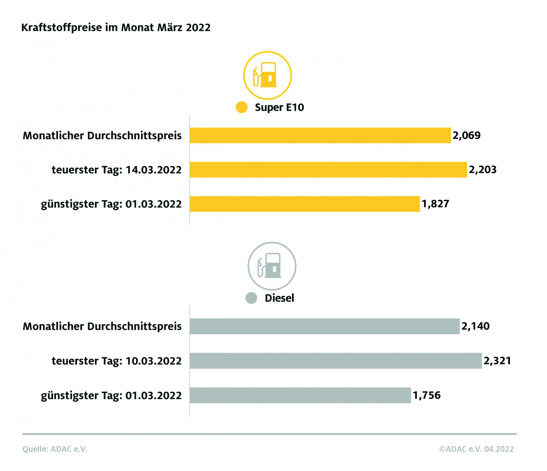 Auch bei den Monatsdurchschnittspreisen zeigt die ADAC Auswertung einen extremen Sprung nach oben: Im Monatsmittel kostete Super E10 2,069 Euro und damit um 32,7 Cent mehr als im Februar 2022, dem bis dato teuersten Monat aller Zeiten. Für Diesel mussten die Tankstellenkunden im März durchschnittlich 2,140 Euro bezahlen – ein Plus von 47,8 Cent gegenüber dem bisherigen Rekordpreis vom Februar.