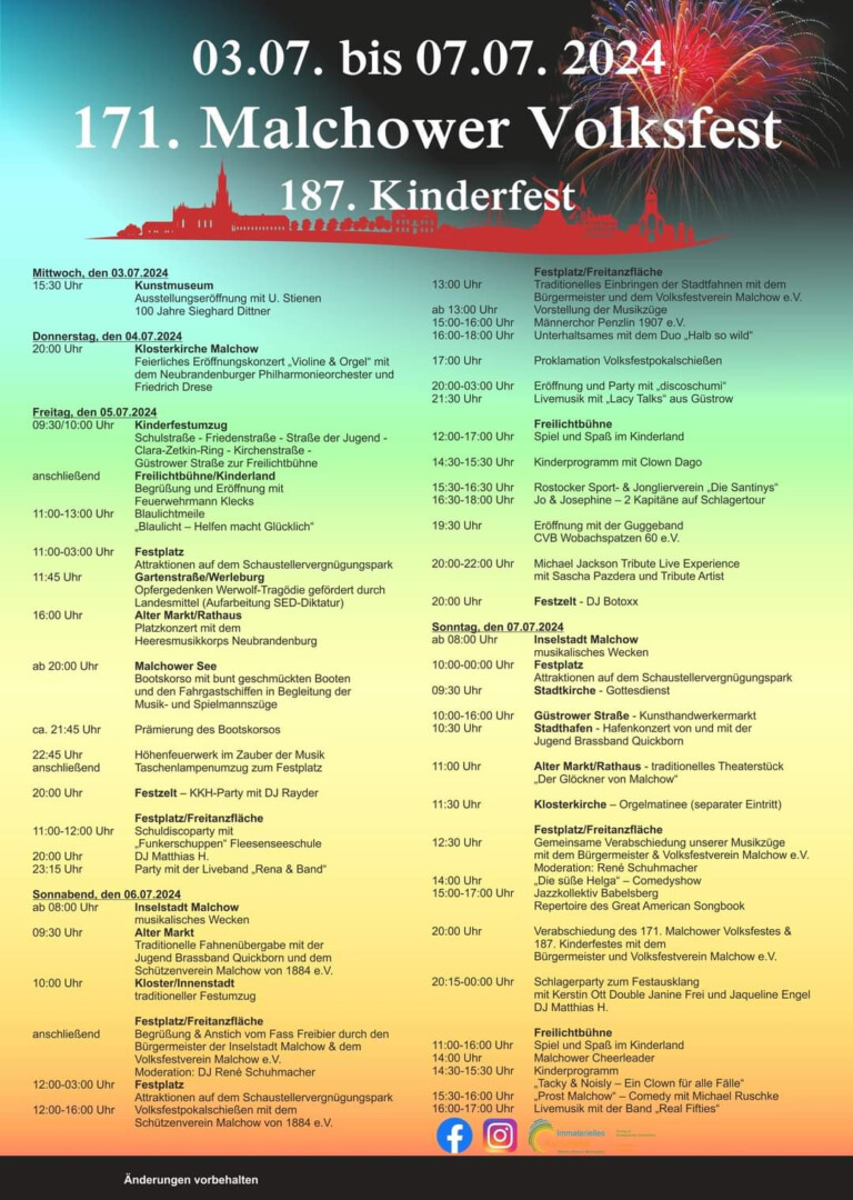 Das Volksfest bietet zudem zwei festliche Umzüge, die die Straßen Malchows in eine bunte Parade verwandeln. Die Veranstalter hoffen auf schönes Wetter, damit die Feierlichkeiten in vollem Umfang genossen werden können.