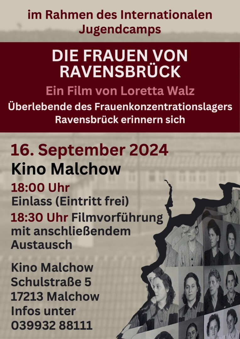 Im Rahmen des Internationalen Jugendcamps lädt die Stadt Malchow am 16. September um 18.30 Uhr zu einer Filmvorführung ins Kino Malchow. Im Anschluss ist ein Austausch mit Sigrid Jacobeit geplant. Sie war von 1992 bis 2005 Leiterin der Mahn- und Gedenkstätte Ravensbrück der Stiftung Brandenburgische Gedenkstätten.