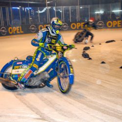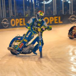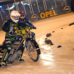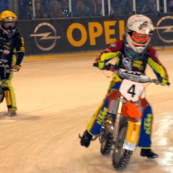 Die Besonderheit an den Speedwaymotorrädern ist, dass die Fahrer ihre Maschinen ohne Bremsen zum Stehen bringen müssen. Das erfordert auf der Sandbahn schon einiges an Können und die Fähigkeit, mit der Maschine umzugehen und ist auf dem Eis noch mal eine Nummer schärfer und kam bei den Zuschauern sehr gut an.