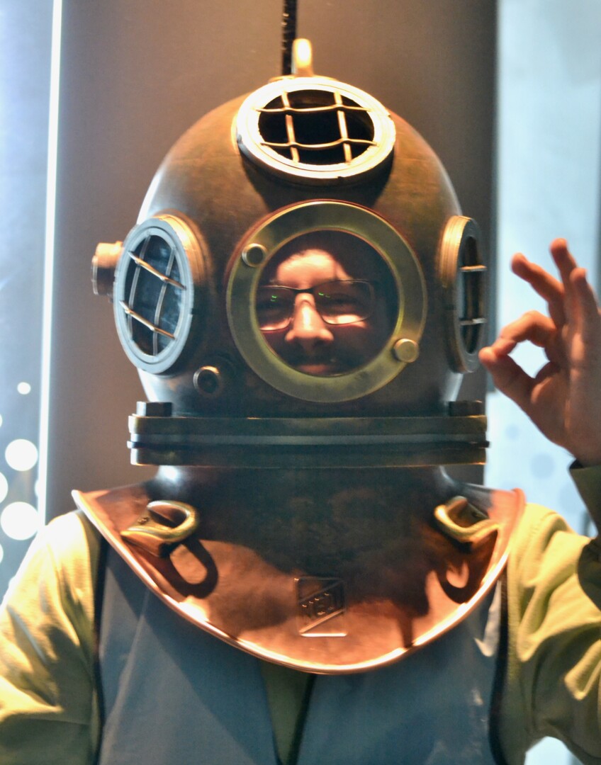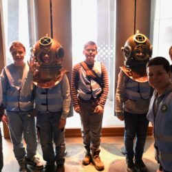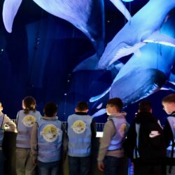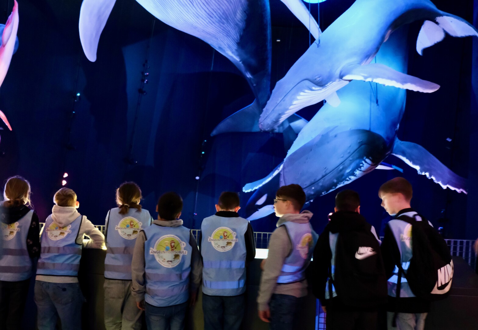 In Stralsund angekommen gingen wir gemeinsam in das riesige Gebäude des Ozeaneums, das in seiner Gestaltung an die Segel eines Schiffes erinnern soll. Im Ozeaneum wurden wir dieses Jahr durch Gerd, den Museumspädagogen, empfangen, der uns zunächst etwas zur Entstehung des Gebäudes erzählte. Anschließend ging es auch in diesem Jahr wieder ins „Reich der Giganten“, wo unsere Petrijünger die Exponate wie Pott- und Buckelwal sowie Manta, Riesenkalmar oder Orca genauer inspizieren und Aug in Aug mit dem riesigen Blauwalmodell treten konnten.