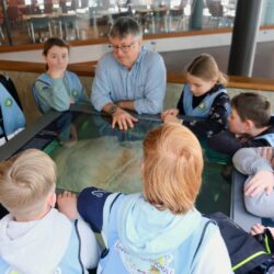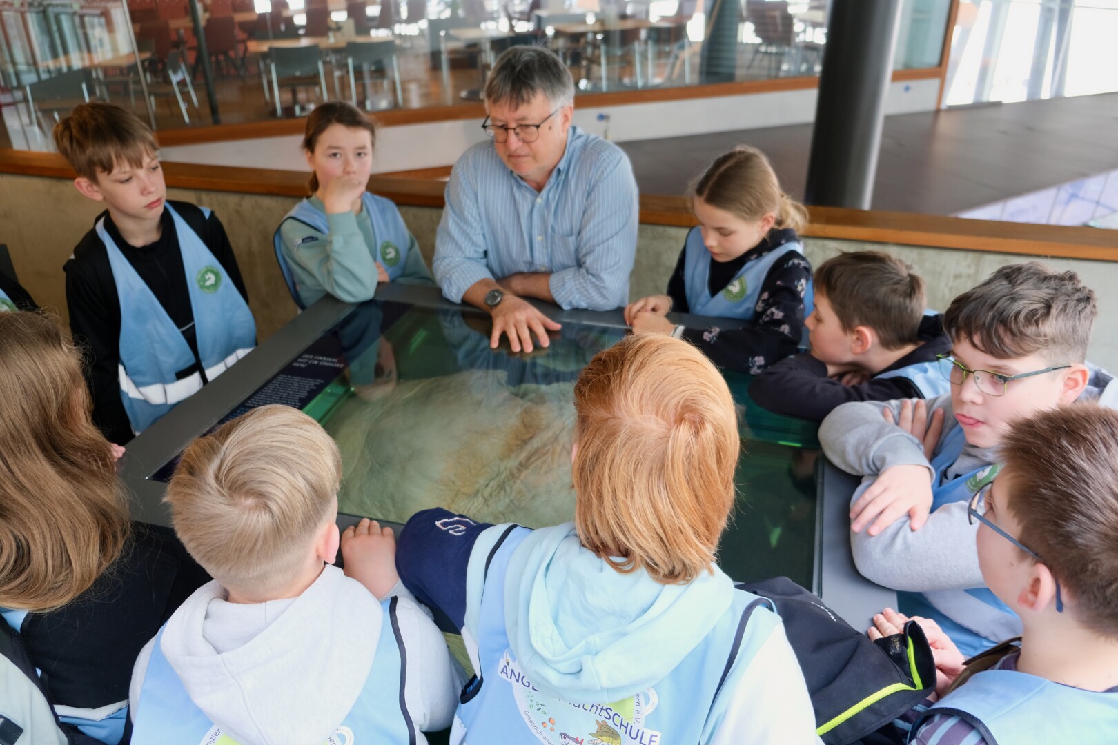 Dann fuhren wir mit der riesigen Rolltreppe des Gebäudes, die fast der Länge eines Blauwals entspricht, in die nächste Etage, von wo aus wir einen guten Blick auf den gigantischen Riemenfisch hatten, der trotz seiner enormen Größe nur ein Gehirn von der Größe einer Erbse hat. Von dort aus führte uns Gerd durch den Bereich der Ostsee, wo er uns anhand eines Modells die Beschaffenheit der Ostsee zeigte und uns am Beispiel der Miesmuschel erklärte, wie unterschiedlich der Nährstoffgehalt in diesem Meer ist. Dies war deutlich an der unterschiedlichen Größe der Miesmuscheln für unsere Jungangler zu erkennen.