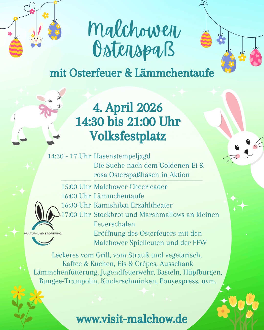 Am morgigen Sonnabend steigt auf dem Volksfestplatz der große Malchower Osterspaß und sorgt für einen bunten Familientag im Freien. Ab 14.30 Uhr verstecken rosa Osterspaßhasen zahlreiche süße Überraschungen im gesamten Gelände. Bei der Hasenstempeljagd für Groß und Klein stehen Mitmachaktionen und kleine Spiele bereit, bei denen die Teilnehmer Stempel sammeln können. Für einen erfolgreich gestempelten Laufzettel gibt es eine Belohnung. Unterwegs gibt es unter anderem Stationen wie die Jugendfeuerwehr Malchow, einen lustigen Fahrrad-Parcours und Osterbasteln.