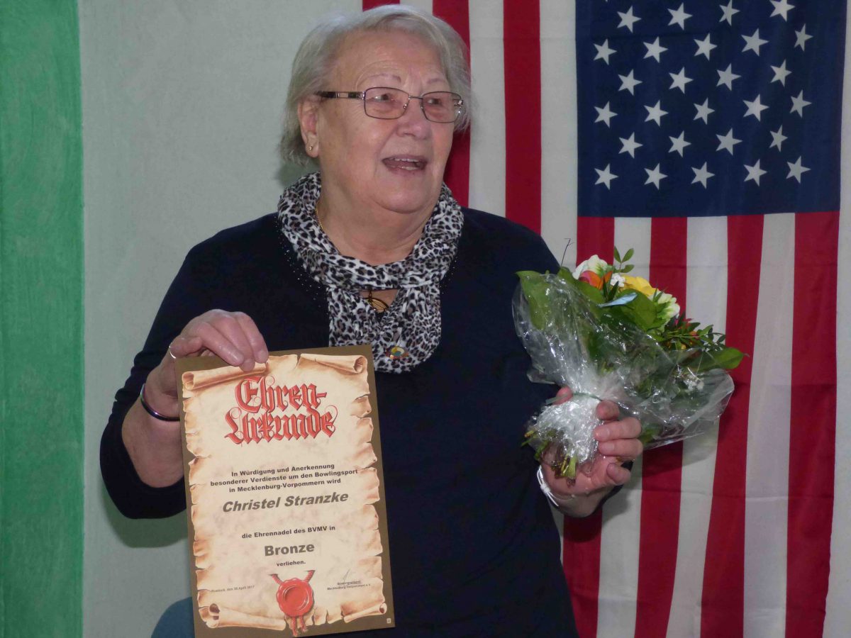 Christel Stranzke vom MSV Malchow ist mit ihren 79 Jahren nicht nur die älteste Bowlingspielerin in Mecklenburg-Vorpommern, für ihre besonderen Verdienste um den Bowlingsport im Land wurde die agile Seniorin jetzt mit der Ehrennadel in Bronze des Bowlingverbandes geehrt.
