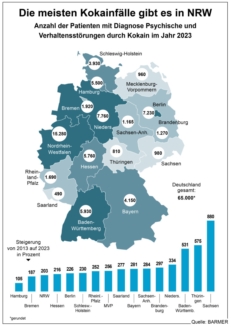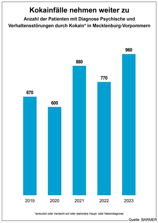 Immer mehr Menschen in Mecklenburg-Vorpommern sind wegen Kokainmissbrauchs in ärztlicher Behandlung. Das geht aus einer aktuellen Auswertung des Barmer Instituts für Gesundheitssystemforschung (bifg) hervor. Demnach gab es im Jahr 2019 landesweit 670 behandelte Patienten, im vergangenen Jahr waren es 960. Bundesweit lag die Anzahl im Jahr 2023 bei rund 65.000 Patienten. Die meisten Betroffenen mit 15.280 wurden in Nordrhein-Westfalen behandelt, gefolgt von Niedersachsen mit 7.760. Die wenigsten Patienten gab es im Saarland mit 490 und in Thüringen mit 810 Frauen und Männern. „Die Zunahme an Behandlungen wegen Kokainmissbrauchs in Mecklenburg-Vorpommern ist Besorgnis erregend. Das wahre Ausmaß wird noch viel größer sein, da wir nur den Bruchteil der Betroffenen in ärztlicher Behandlung sehen. Auch die aktuelle bundesweite Kriminalstatistik zeigt, dass die Zahl der Kokaindelikte im Vergleich von 2022 zu 2023 um gut 27 Prozent gestiegen ist und damit einen neuen Höchststand erreicht hat“, sagt Henning Kutzbach, Landesgeschäftsführer der Barmer in Mecklenburg-Vorpommern.