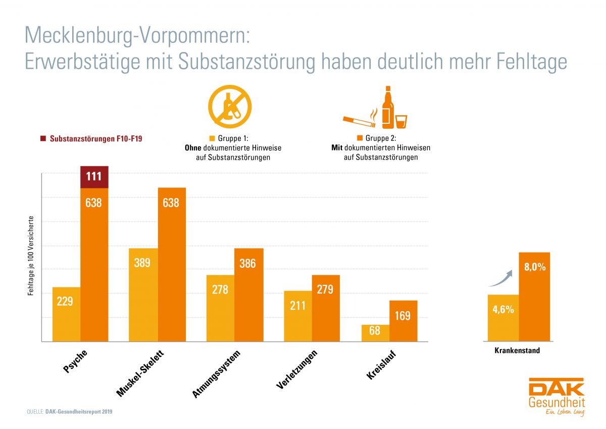 Laut DAK-Gesundheitsreport 2019 haben Arbeitnehmer in Mecklenburg-Vorpommern mit Hinweisen auf Substanzstörungen, wie beispielsweise eine Alkoholabhängigkeit, deutlich mehr Fehltage im Job als ihre Kollegen ohne auffällige Probleme. Der Krankenstand der Betroffenen ist mit acht Prozent fast doppelt so hoch. Sie fehlen aber nicht nur im Job, weil sie wegen ihrer Suchtproblematik krankgeschrieben werden. Vielmehr zeigen sich bei ihnen in allen Diagnosegruppen mehr Fehltage. Besonders deutlich ist der Unterschied bei den psychischen Leiden. Hier sind die Fehltage mehr als dreimal so hoch. Bei Muskel-Skelett-Erkrankungen wie Rückenschmerzen gibt es ein Plus von rund 64 Prozent, bei Atemwegserkrankungen sind es 38 Prozent. Insgesamt gibt es nach der DAK-Studie unter den Erwerbstätigen in Mecklenburg-Vorpommern 142.000 abhängige Raucher, knapp 7.000 erfüllen die Kriterien einer Social Media-Sucht.