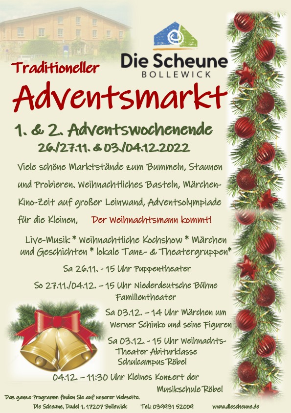 Pfefferkuchen, Glühweinduft und Kerzenflackern – die Scheune Bollewick lädt an zwei Wochenenden wieder zum Mecklenburger Adventsmarkt ein und das in diesem Jahr schon zum 28. Mal.Los geht’s bereits am kommenden Sonnabend und Sonntag, 26 und 27. November.