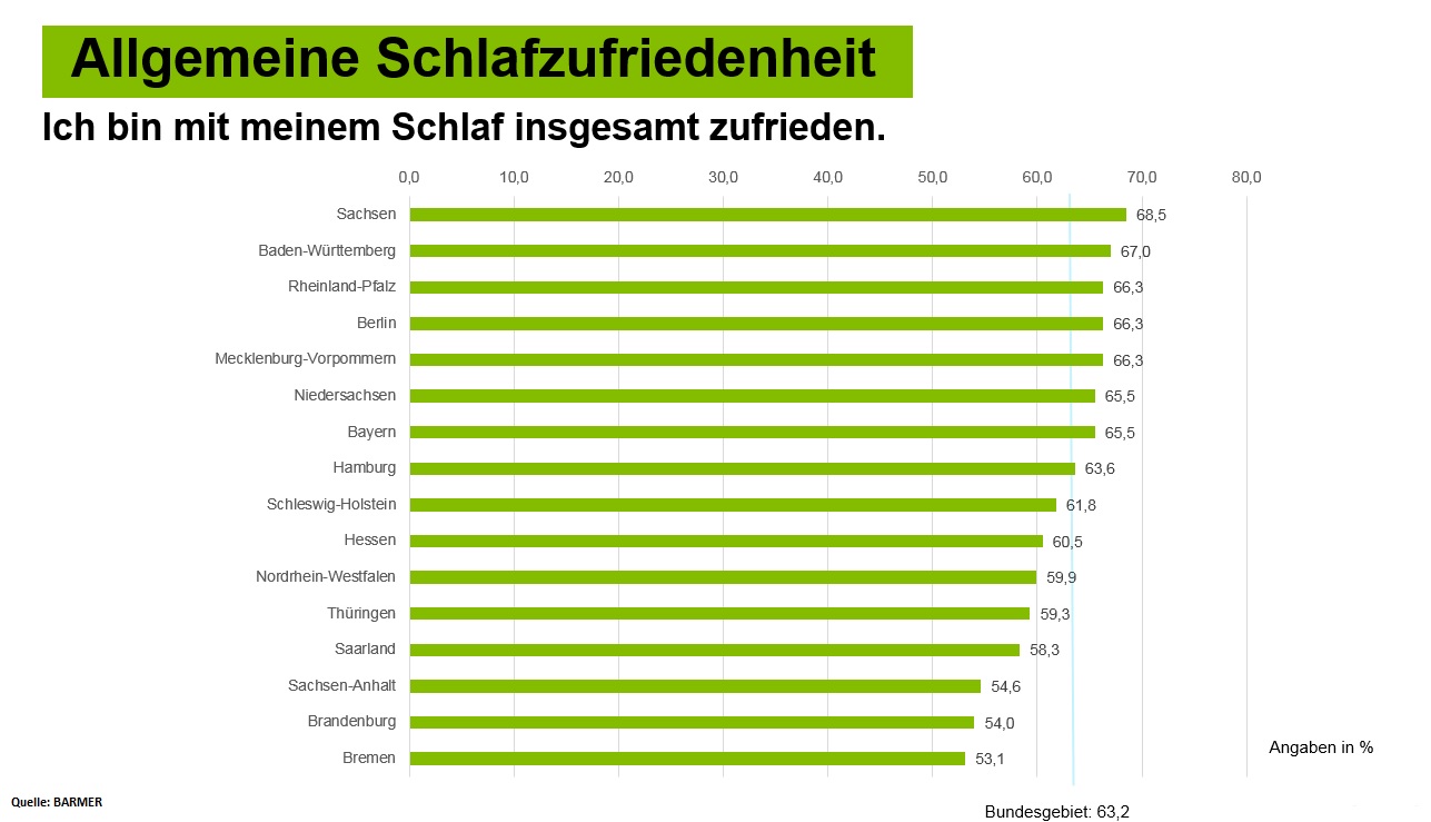 „Schlaf ist ausschlaggebend für die seelische und körperliche Gesundheit, deshalb ist der Zufriedenheitswert ein positiver Trend. Die Gründe, warum sich viele dennoch nicht ausgeschlafen fühlen, sind individuell“, erklärt Henning Kutzbach, Landesgeschäftsführer der BARMER in Mecklenburg-Vorpommern. Knapp ein Drittel (27,5 Prozent) der Mecklenburger und Vorpommern gaben an, dass sie vor allem beruflicher oder privater Stress oder gesundheitliche Probleme an einem ungestörten Schlaf hindern. Auch finanzielle Sorgen, nächtlicher Harndrang oder kleine Kinder hielten vom Schlafen ab.