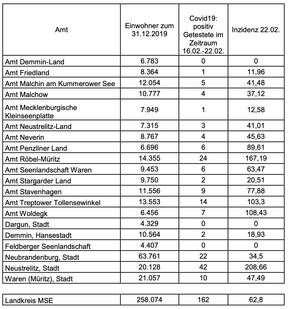Auch heute hat der Landkreis Mecklenburgische Seenplatte wieder die Corona-Zahlen für die einzelnen Städte und Ämter bekanntgegeben. Danach hat derzeit die Stadt Neustrelitz mit 208,66 die höchste Inzidenz. Gefolgt vom Amt Röbel Müritz mit 167,19 und dem Amt Woldegk mit 108,43. Für das Amt Malchow wird eine Inzidenz von 37,12 gemeldet, für das Penzliner Land von 89,61, für das Amt Seenlandschaft Waren von 63,47 und für die Stadt Waren von 47,49.