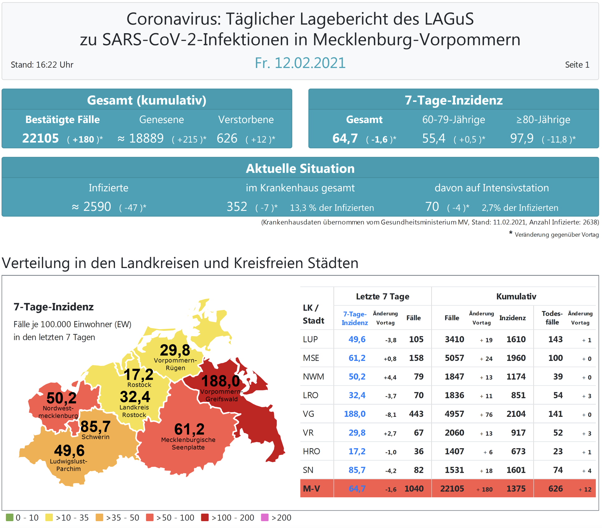 Der Inzidenzwert für ganz Mecklenburg-Vorpommern liegt heute bei 64,7 (gestern 66,4). Insgesamt meldet das Land Mecklenburg-Vorpommern heute 180 Neuinfektionen. Der Landkreis Vorpommern-Greifswald hat weiterhin eine Inzidenz unter 200.