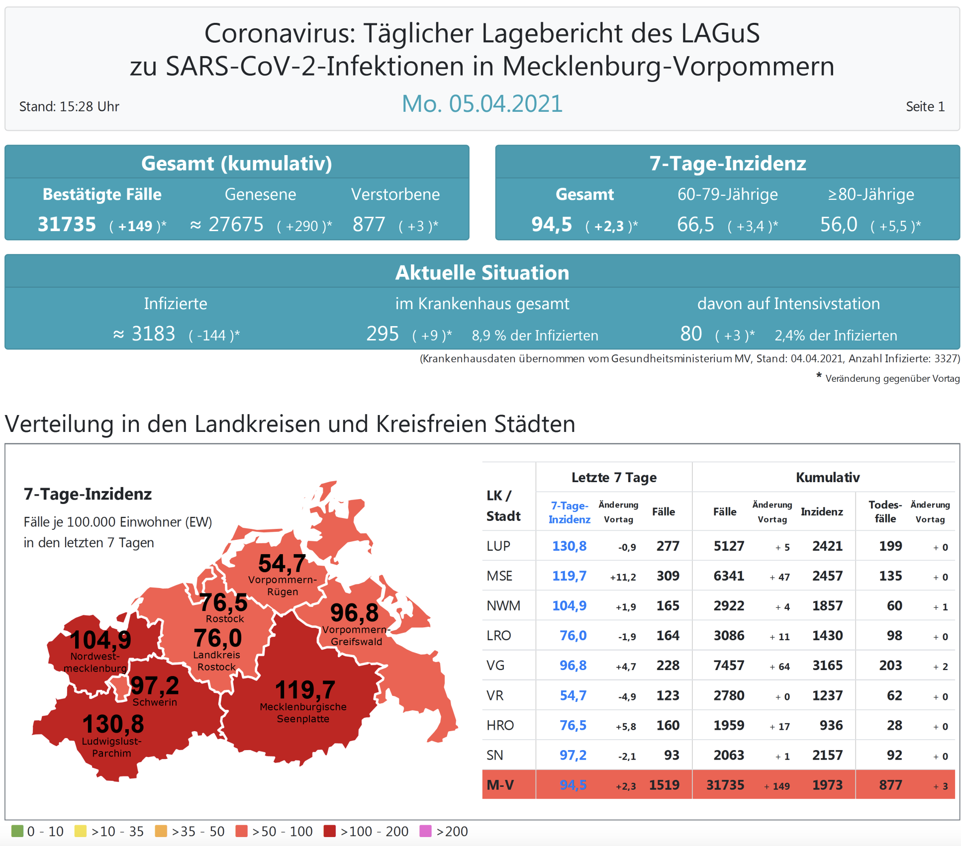 Der Inzidenzwert für ganz Mecklenburg-Vorpommern ist ebenfalls gestiegen und liegt heute bei 94,5 (gestern 92,3). Insgesamt meldet das Land Mecklenburg-Vorpommern heute 149 Neuinfektionen. Die höchste Inzidenz hat der Landkreis Ludwigslust-Parchim mit heute 130,8.