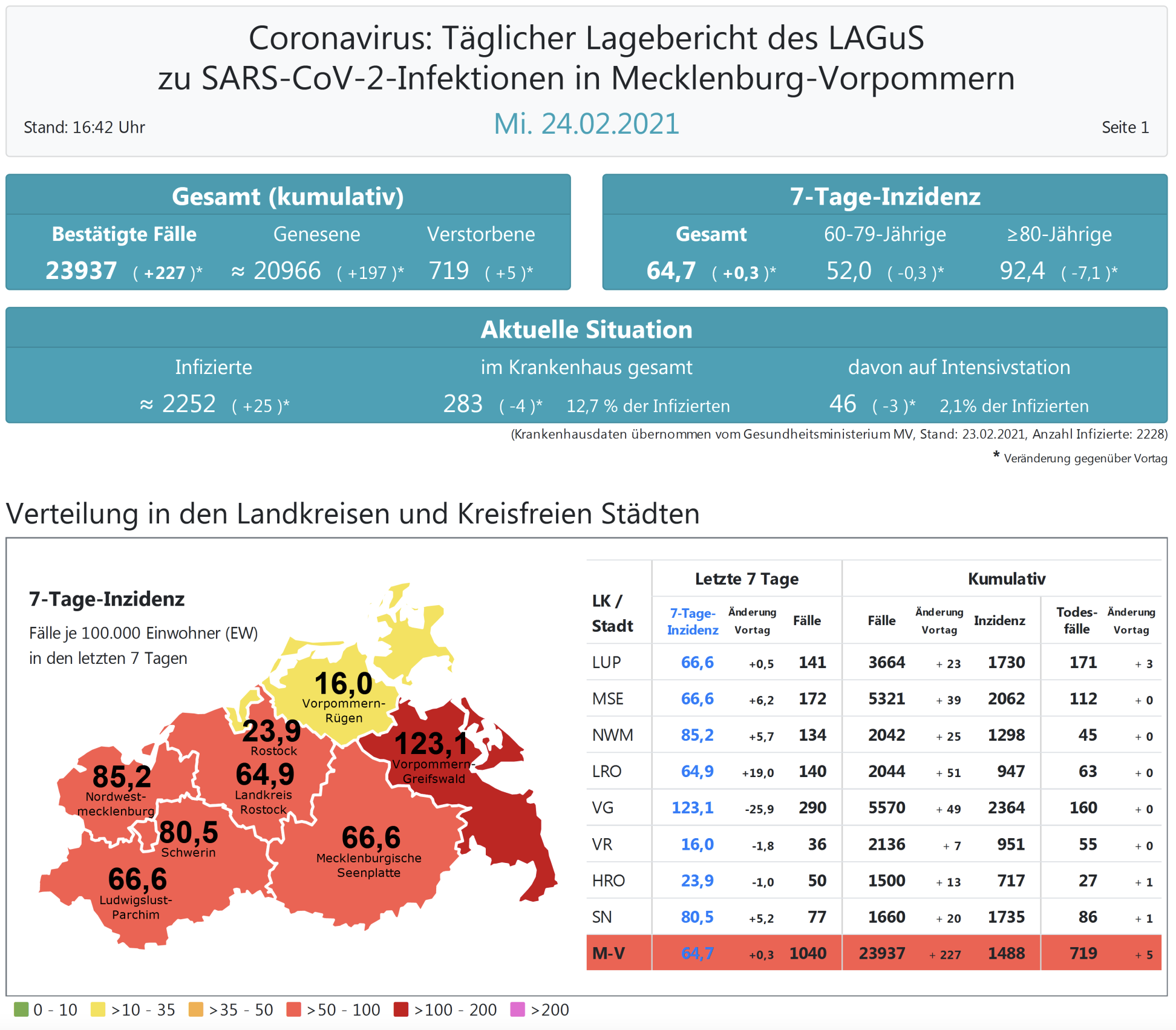 Der Inzidenzwert für ganz Mecklenburg-Vorpommern ist nahezu unverändert und liegt heute bei 64,7 (gestern 64,4). Insgesamt meldet das Land Mecklenburg-Vorpommern heute 227 Neuinfektionen. Die höchste Inzidenz hat nach wie vor der Landkreis Vorpommern-Greifswald mit jetzt 123,1.