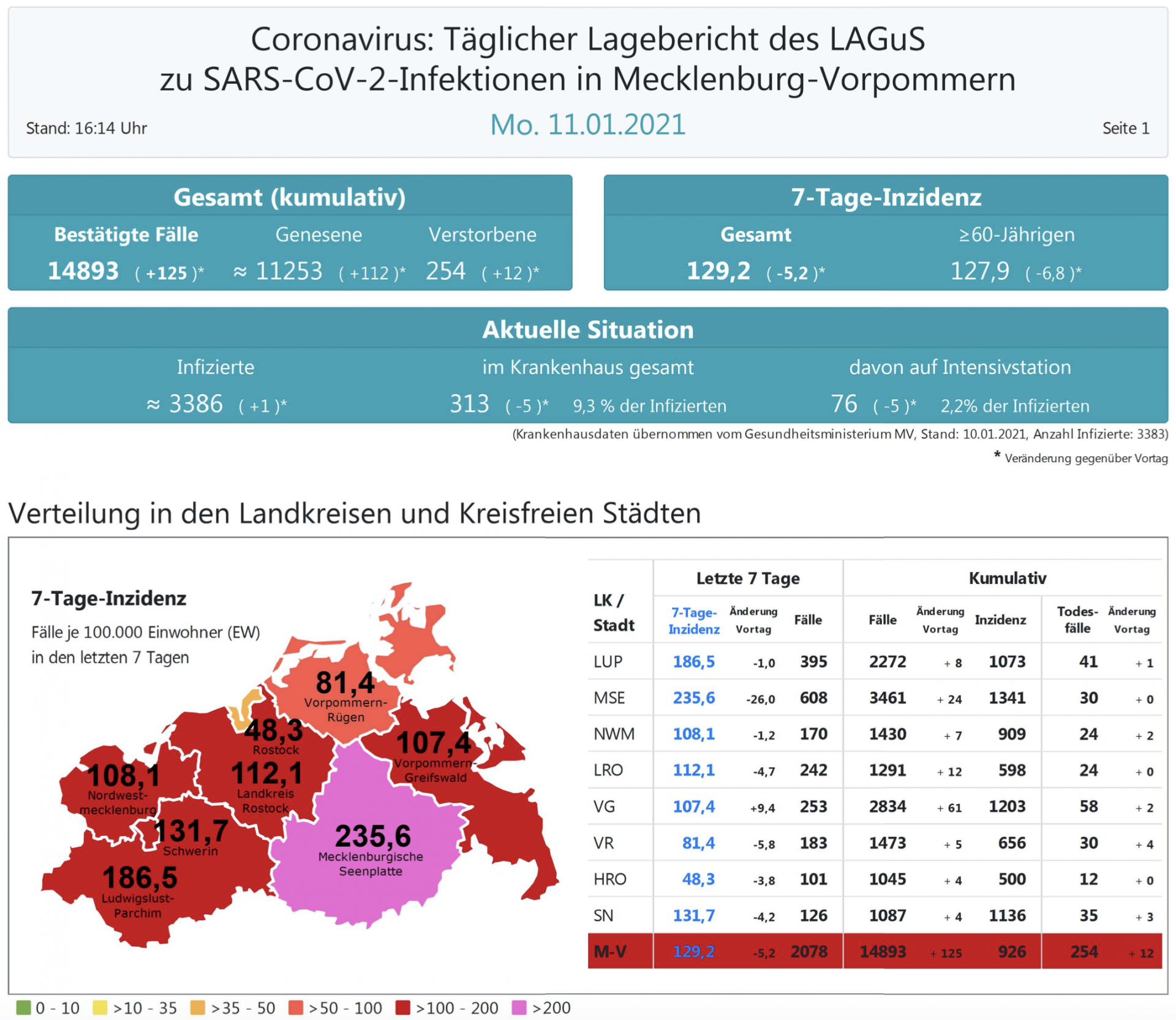 Insgesamt wurden in Mecklenburg-Vorpommern bisher 14 893 Infektionen festgestellt. Im Land gab es bislang 254 Todesfälle, 12 mehr als gestern, der Landkreis Mecklenburgische Seenplatte meldet heute keinen neuen Todesfall.