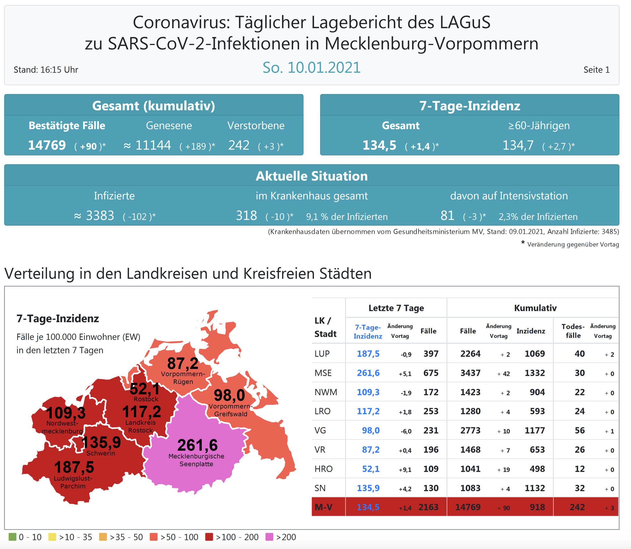 Insgesamt wurden in Mecklenburg-Vorpommern bisher 14 769 Infektionen festgestellt. Im Land gab es bislang 242 Todesfälle, 3 mehr als gestern, der Landkreis Mecklenburgische Seenplatte meldet heute einen neuen Todesfall.