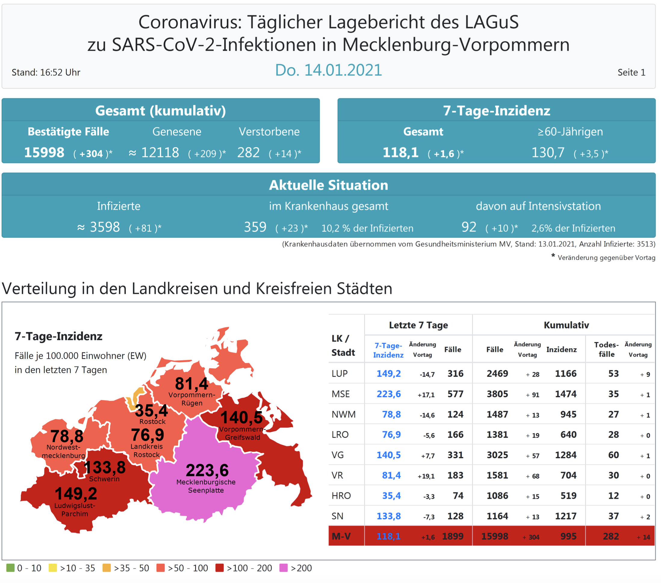 Insgesamt wurden in Mecklenburg-Vorpommern bisher 15 998 Infektionen festgestellt. Im Land gab es bislang 282 Todesfälle, 14 mehr als gestern, der Landkreis Mecklenburgische Seenplatte meldet heute einen neuen Todesfall.
