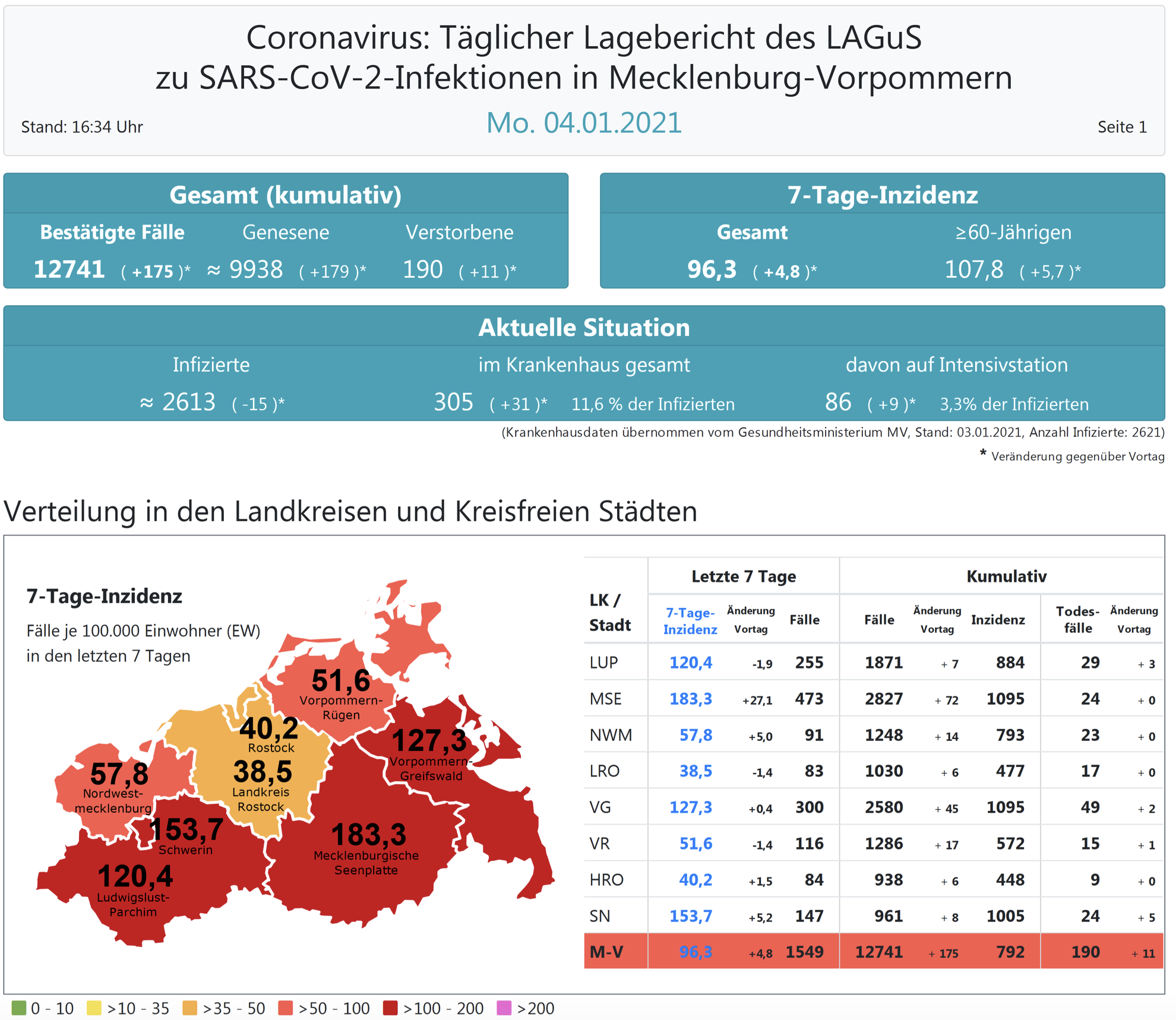 Das Landesamt für Gesundheit registriert für Mecklenburg-Vorpommern bis heute Nachmittag 175 neue Fälle. Der Landkreis Mecklenburgische Seenplatte meldet 72 und damit mit Abstand die meisten Neuinfektionen. Der Inzidenzwert liegt in unserem Landkreis heute bei 183,3 also weiter am höchsten in Mecklenburg-Vorpommern. Auch in ganz Mecklenburg-Vorpommern ist dieser Wert wieder gestiegen und rückt immer mehr in Richtung 100 – heute wird er mit 96,3 angegeben.