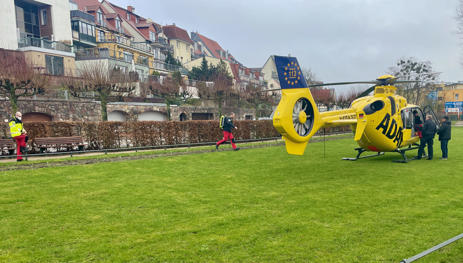 Nach der Erstbehandlung flog „Christoph 48“ – stationiert in Neustrelitz – ohne Patienten wieder ab, der wurde mit dem Rettungswagen in ein Krankenhaus gefahren. Die Warener Polizei hat die Landung abgesichert.