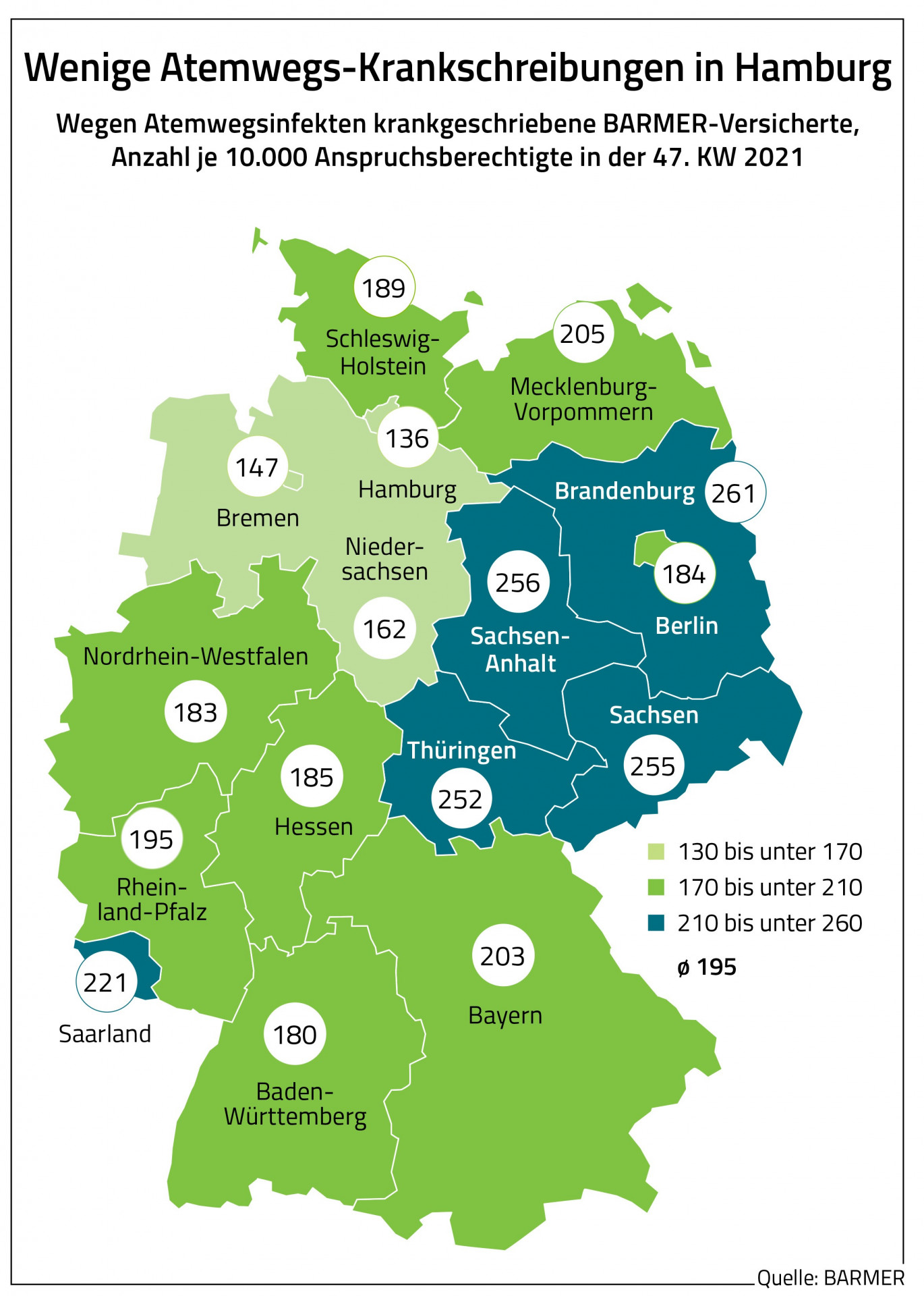 Am geringsten betroffen waren Hamburg und Bremen mit 136 beziehungsweise 147 je 10.000 BARMER-Versicherten mit Anspruch auf Krankengeld. „Die notwendigen Schutzmaßnahmen gegen die Corona-Pandemie unterdrücken auch die üblichen saisonalen Atemwegsinfekte und die Grippe. Auch aus diesem Grund sollten die Abstands- und Hygieneregeln dringend eingehalten werden“, sagt Straub.