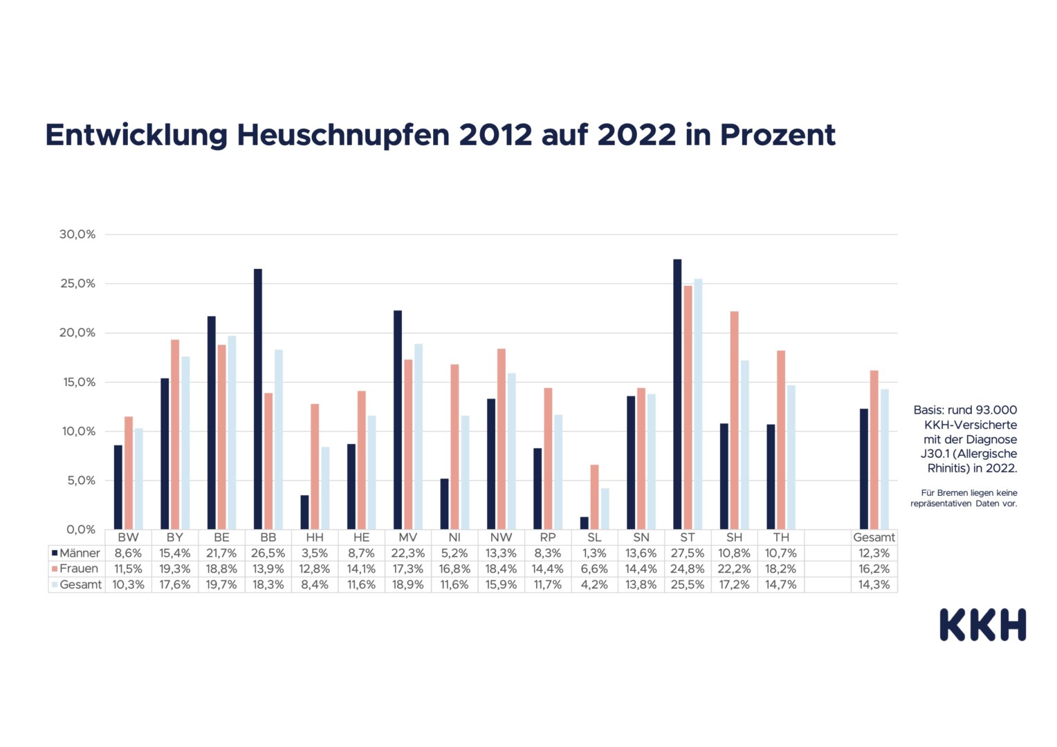 Längst fliegen Pollen von Hasel oder auch Erle vielerorts durch die Lüfte und sorgen bei Allergikern für juckende Augen, Niesattacken oder gar Atemnot. Dabei nimmt die Zahl der Betroffenen in Mecklenburg-Vorpommern stetig zu, wie Daten der KKH Kaufmännische Krankenkasse zeigen. So stieg der Anteil der Pollenallergiker unter den Versicherten von 2012 auf 2022 um 18,9 Prozent – bei Männern um 22,3 Prozent, bei Frauen um 17,3 Prozent. Im Bundesdurchschnitt hat sich der Anteil Betroffener innerhalb dieser zehn Jahre um 14,3 Prozent erhöht. Damit liegt MV über dem deutschlandweiten Anstieg und hat im Ländervergleich die dritthöchste Steigerungsrate – nach Sachsen-Anhalt (25,5 Prozent) und Berlin (19,7 Prozent).
