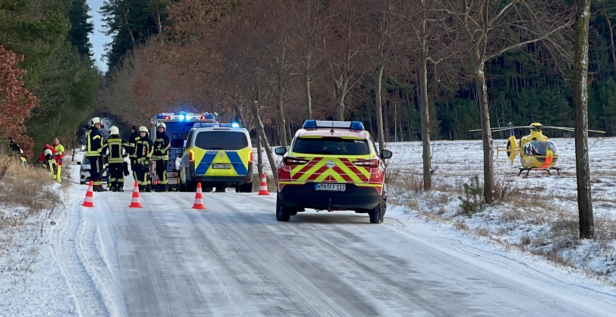 Viele Unfälle in den letzten 24 Stunden auch im Bereich der Mecklenburgischen Seenplatte: Die Straßenverhältnisse sind von einigen Verkehrsteilnehmern offenbar unterschätzt worden. Der schwerste Unfall ereignete sich heute Nachmittag auf der Straße von Waren nach Federow. Dort kam ein 24 Jahre alter Quadfahrer von der Straße ab und krachte gegen einen Baum. Der junge Mann erlitt schwere Verletzungen, ein Rettungshubschrauber, Rettungsdienst, Polizei und Feuerwehr waren im Einsatz (Foto).
