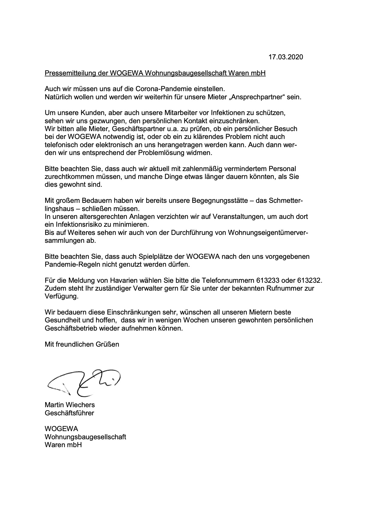 Aktuelle Mitteilung des größten Vermieters in Waren – WOGEWA: