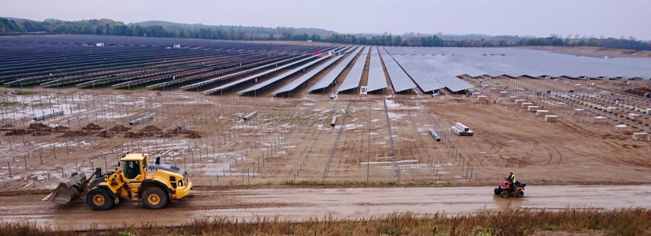 Interessant ist, dass das Gros der Paneele auf dem tief ausgehobenen Boden des Tagebaus aus dem Sichtfeld verschwindet. Nur seitlich, auf einer Bodendeponie mit Aushub, erheben sich die Paneelkonstruktionen oberhalb der Grube. Rund 45 Millionen Euro investieren die Wemag und die Landeskirche Württemberg in das Gelände, das so groß ist wie 123 Fußballfelder.