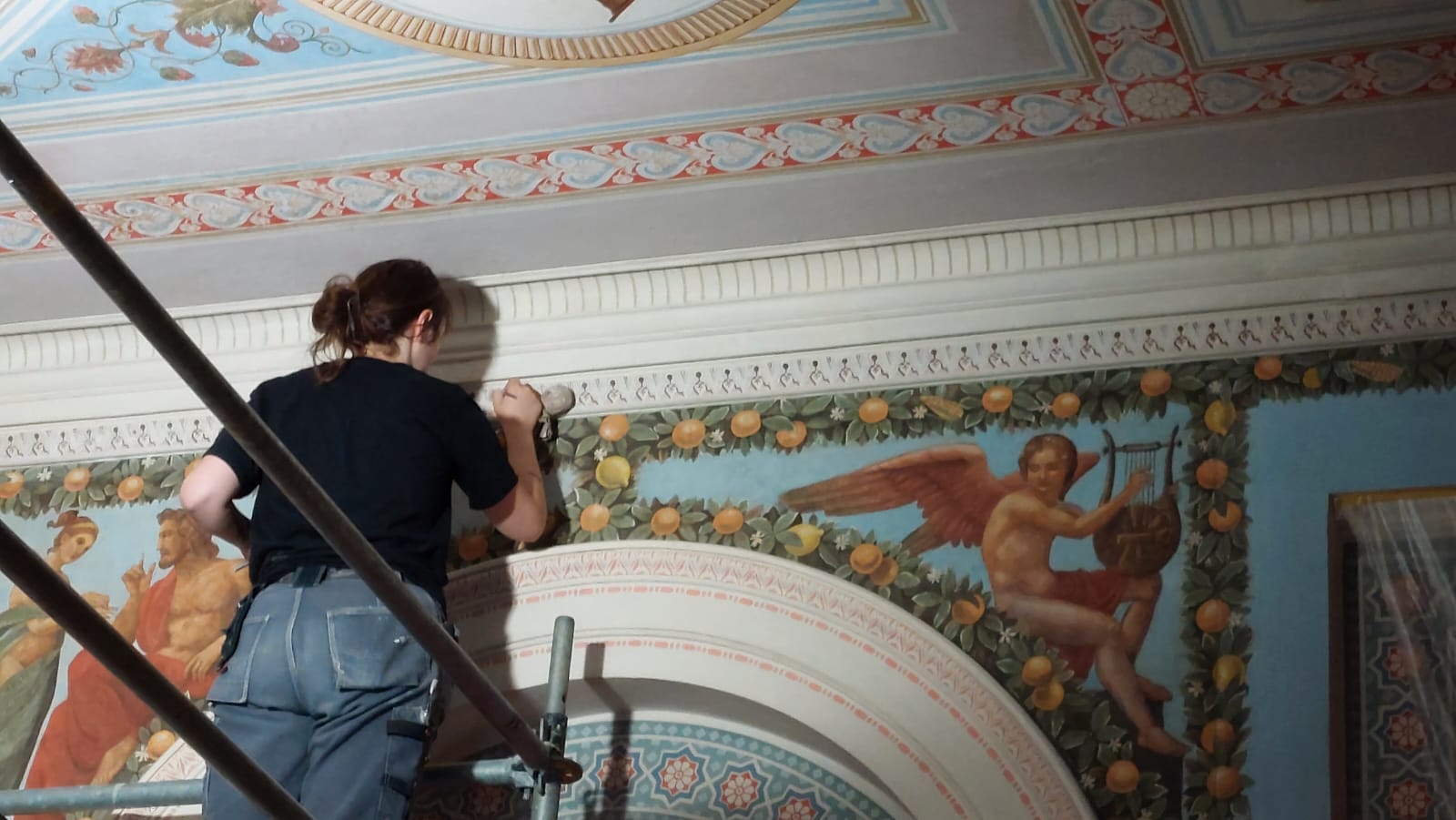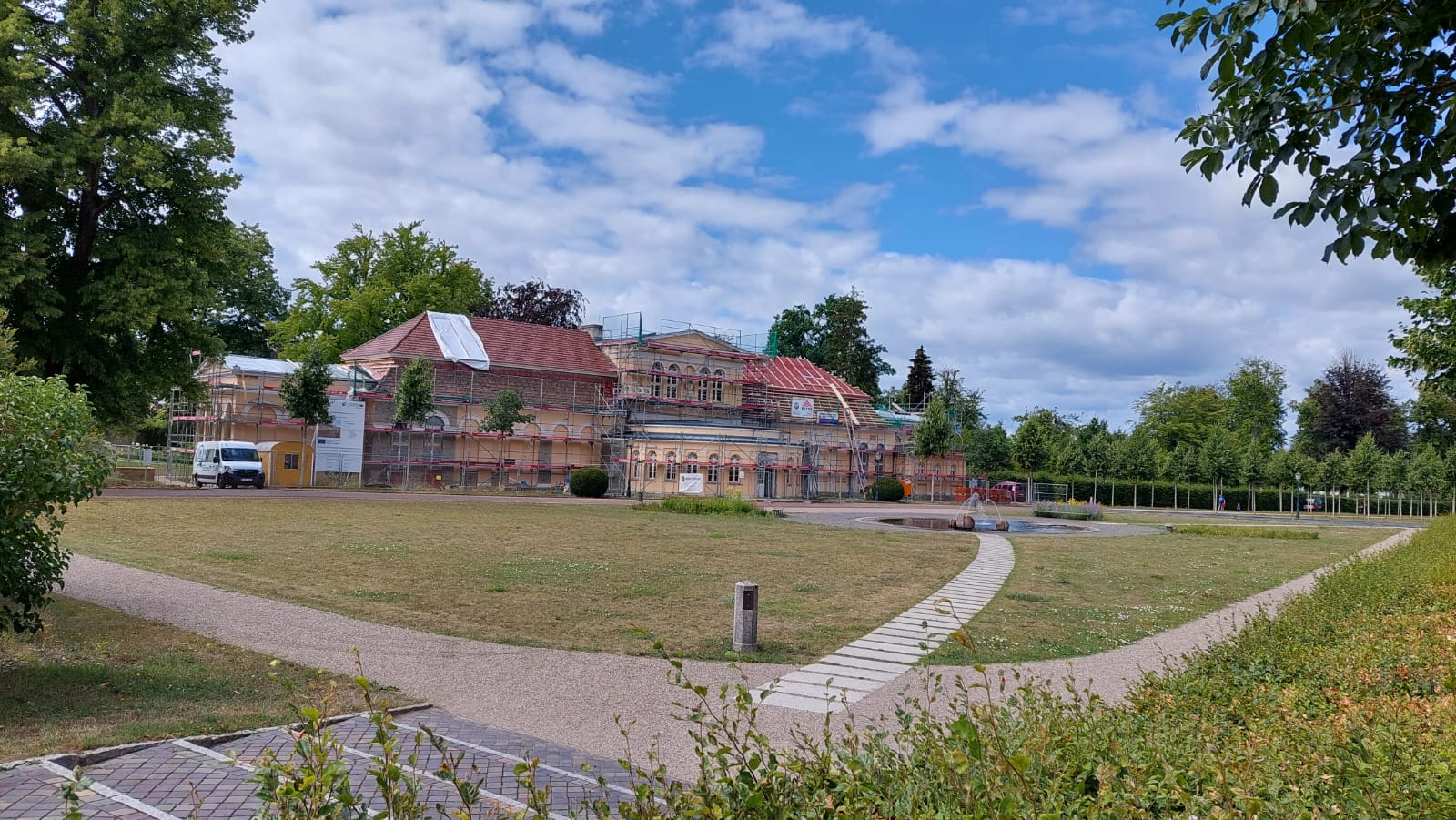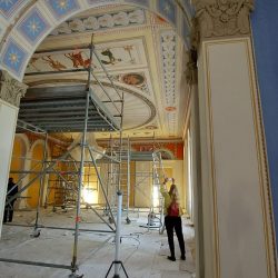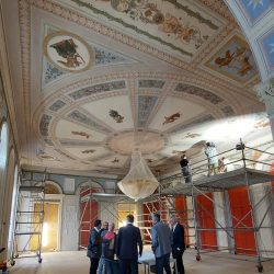 Dazu wird im Inneren des Baus – im blauen, roten und gelben Salon – kräftig restauriert. Geschickte Frauen als Spezialisten in Sachen Kirchenmalerei haben bereits große Teile der Decken- und Wandmalereien und -gestaltungen restauriert. Die Skulpturen sind noch in den Werkstätten. Mit der Fertigstellung soll auch wieder eine Gastronomie in die Orangerie einziehen, wünschen sich Stadt und Land.