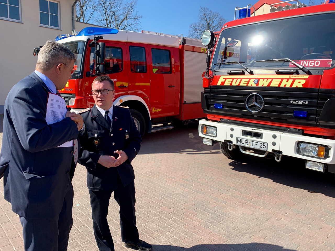 Für die Freiwillige Feuerwehr Waren gab’s schon vor Ostern ein richtig dickes Geschenk: Innenminister Lorenz Caffier (CDU) hat heute einen Fördermittelbescheid über 130 000 Euro für ein neues Löschfahrzeug vorbeigebracht. Das alte hat schon mehr als 25 Jahre auf dem Buckel und soll ausgetauscht werden. Alles in allem kostet das neue Fahrzeug rund 320 000 Euro – neben den Fördermitteln vom Land kommen auch noch 30 000 Euro vom Kreis, die Stadt Waren zahlt etwa 160 000 Euro.