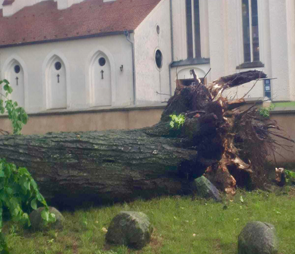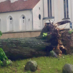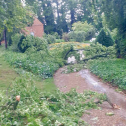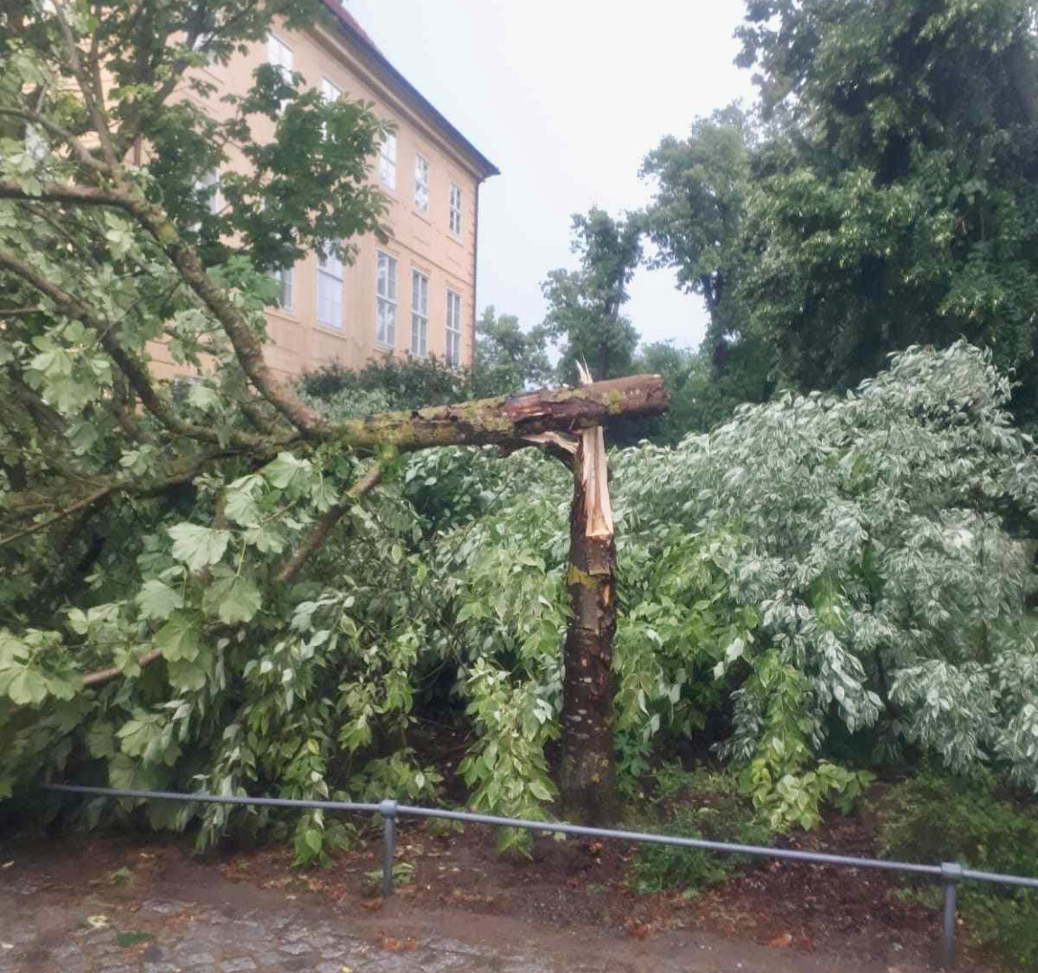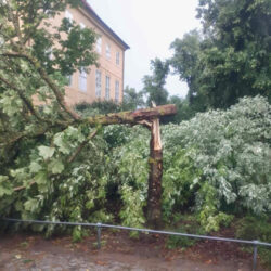 Während die Müritz-Region beim gestrigen Gewitter ziemlich glimpflich davon gekommen ist, hat der Sturm etwas weiter südlich in Mirow richtig gewütet. Im Bereich der Mirower Schlossinsel knickten zahlreiche Bäume ab, andere dicke Bäume wurden gar entwurzelt, Außenmöbel flogen durch die Gegend, Lampen am Wegesrand zersprangen.