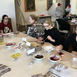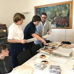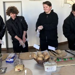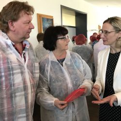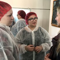 Viele staunende Blicke gab’s beim Rundgang durch die Produktion, denn mit so viel Handarbeit hatten die Mädchen und Jungen gar nicht gerechnet. Und auch nicht mit so vielen Hygenievorschriften. Nicht nur, dass die Schüler sich „verkleiden“ mussten und mit Kittel und Haube ausgestattet wurden. Einige betraten die Bäckerei auch mit blauen Pflastern an der Nase oder den Ohren. Denn wer sein Piercing oder Ohrring nicht entfernen konnte oder wollte, musste es abkleben. Aus Sicherheitsgründen, der so ein Piercing möchte wohl kein Kunde im Brot finden.