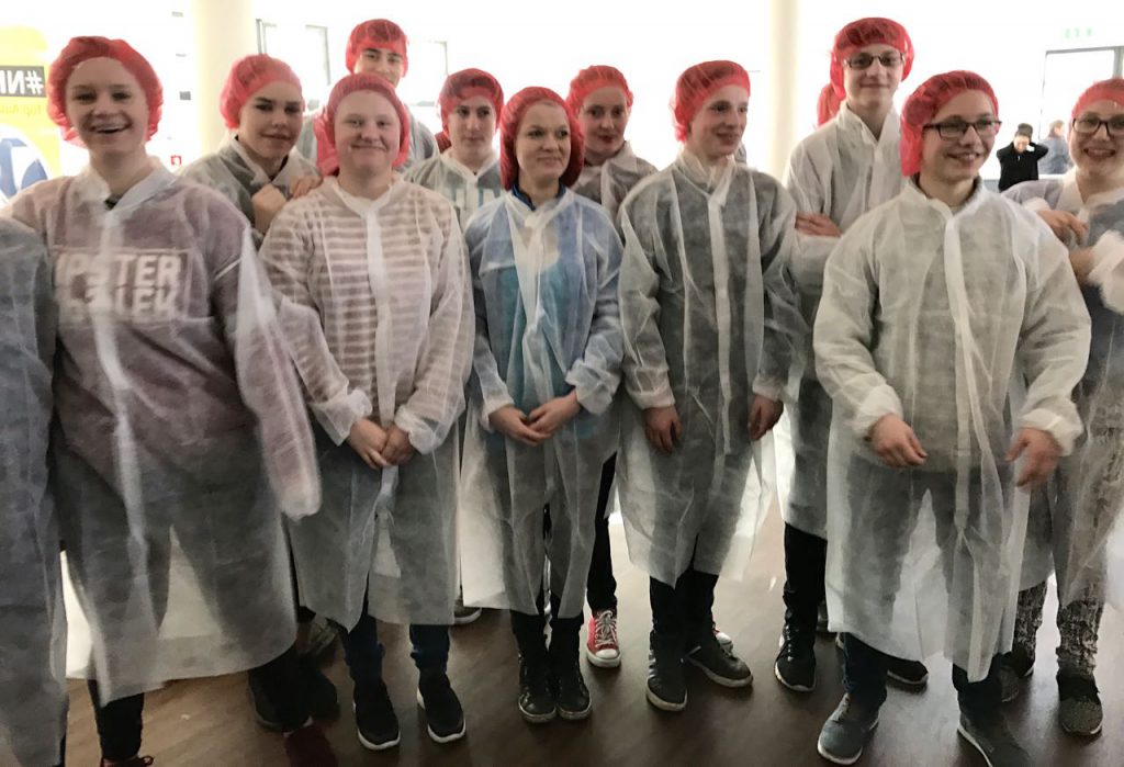 Viele staunende Blicke gab’s beim Rundgang durch die Produktion, denn mit so viel Handarbeit hatten die Mädchen und Jungen gar nicht gerechnet. Und auch nicht mit so vielen Hygenievorschriften. Nicht nur, dass die Schüler sich „verkleiden“ mussten und mit Kittel und Haube ausgestattet wurden. Einige betraten die Bäckerei auch mit blauen Pflastern an der Nase oder den Ohren. Denn wer sein Piercing oder Ohrring nicht entfernen konnte oder wollte, musste es abkleben. Aus Sicherheitsgründen, der so ein Piercing möchte wohl kein Kunde im Brot finden.