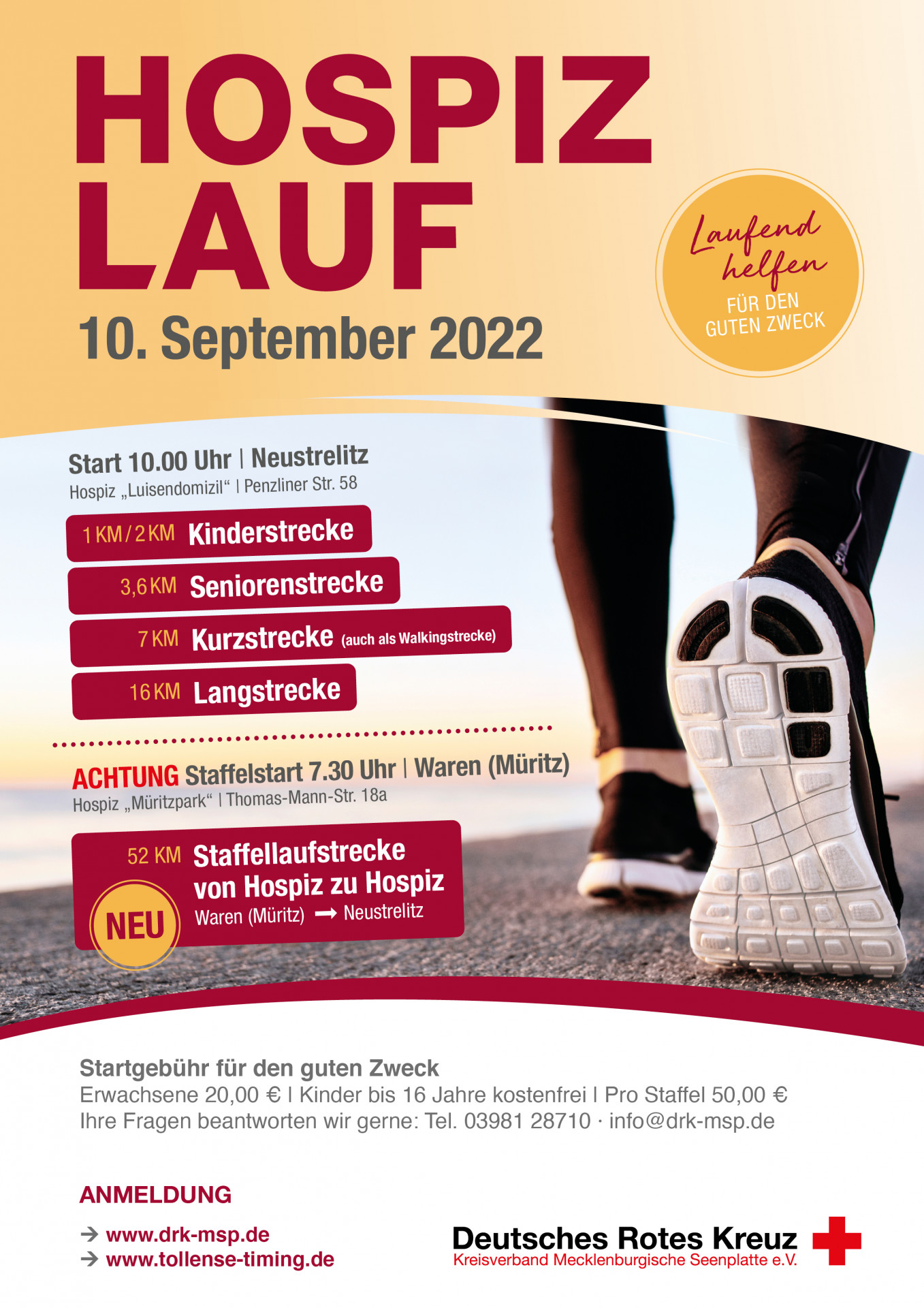 Ob klein, ob groß – jeder kann einen Beitrag dazu leisten. „In einer großen Gemeinschaft können wir eine hohe Aufmerksamkeit für dieses Thema in der Öffentlichkeit erreichen und dabei über die Startgebühr für den guten Zweck auch noch Geld sammeln, das ausschließlich der Finanzierung der Hospizarbeit zugute kommt“, heißt es vom DRK Mecklenburgische Seenplatte. Neben dem Hospizlauf gibt es ein buntes Familienprogramm inklusive Kinderbetreuung.