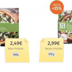 - Die Naturgut Bio Holzofen-Pizza mit Mozzarella, Spinat & Feta von Penny kostet 2,99 Euro statt 2,49 Euro. Gleichzeitig sank das Gewicht der Pizza von 460 auf 410 Gramm. Verbraucher zahlen demnach 35 Prozent mehr für das Produkt.
