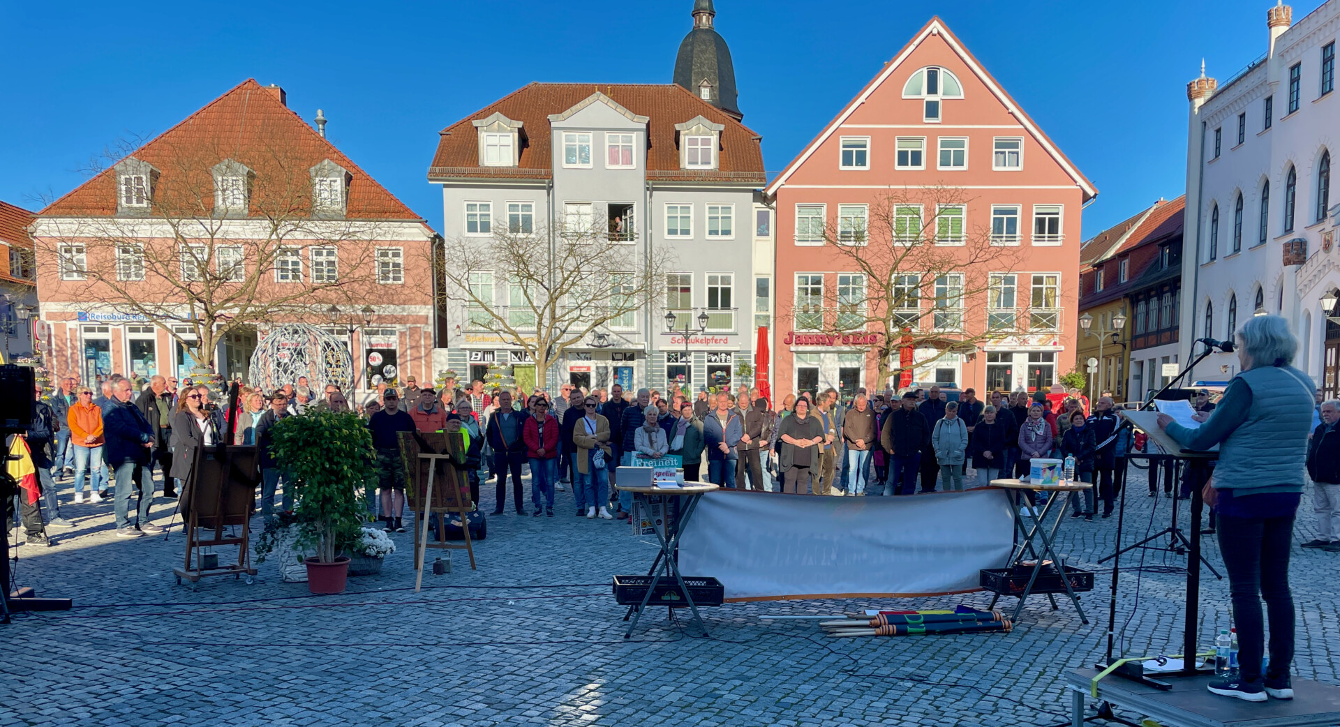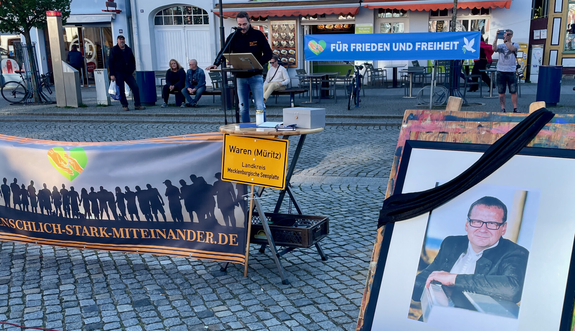 Montagsdemonstration in Waren – so wie jeden Montag seit vielen Wochen und Monaten. Und doch ganz anders. Zwar ging es auch heute um die aktuelle Politik, um Corona, den Krieg und Freiheit. Doch die Reden kamen nicht nur von jemandem, der auf dem Markt stand, sondern aus dem Lautsprecher – von Thomas Müller, dem Gründer der Initiative „Menschlich – Stark – Miteinander“. Er ist am vergangenen Mittwoch im Alter von 57 Jahren gestorben (WsM berichtete).