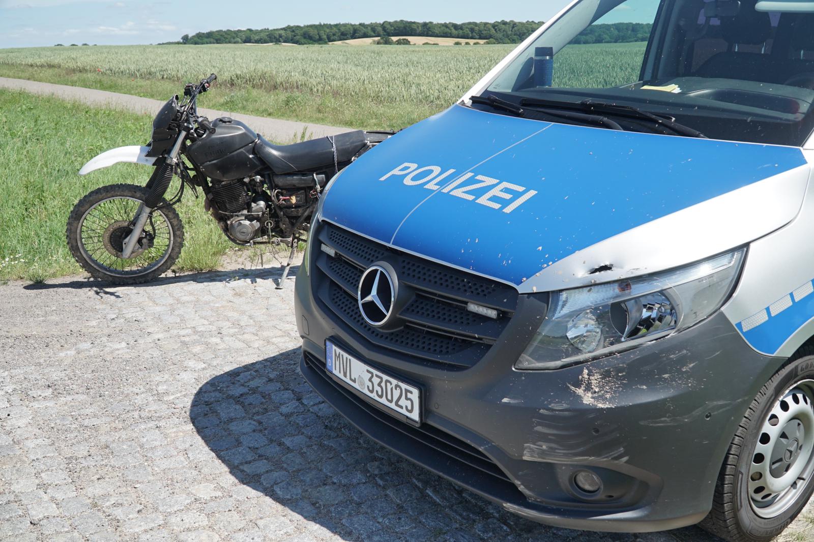Als Warens Polizisten heute Nachmittag in Penzlin einen Motorradfahrer kontrollieren wollten, weil an seiner Maschine die Spiegel fehlten und der Fahrer nicht geblinkt hat, wollte er sich aus dem Staub machen. Die Beamten hatten das Anhaltesignale sowie das Blaulicht eingeschaltet, beides ignorierte der Motorradfahrer und flüchtete in Richtung Wulkenzin. Hinter dem Ortsausgang Penzlin in Richtung Neubrandenburg fuhr der Motorradfahrer von der B 192 nach links auf einen parallel verlaufenden Rad- und Gehweg – und zwar mit hoher Geschwindigkeit.