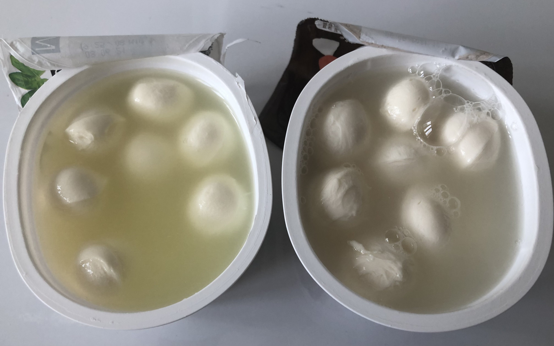 Bild: Mozzarella: links Normalzustand, rechts verändert durch Keime zum Ende des MHD