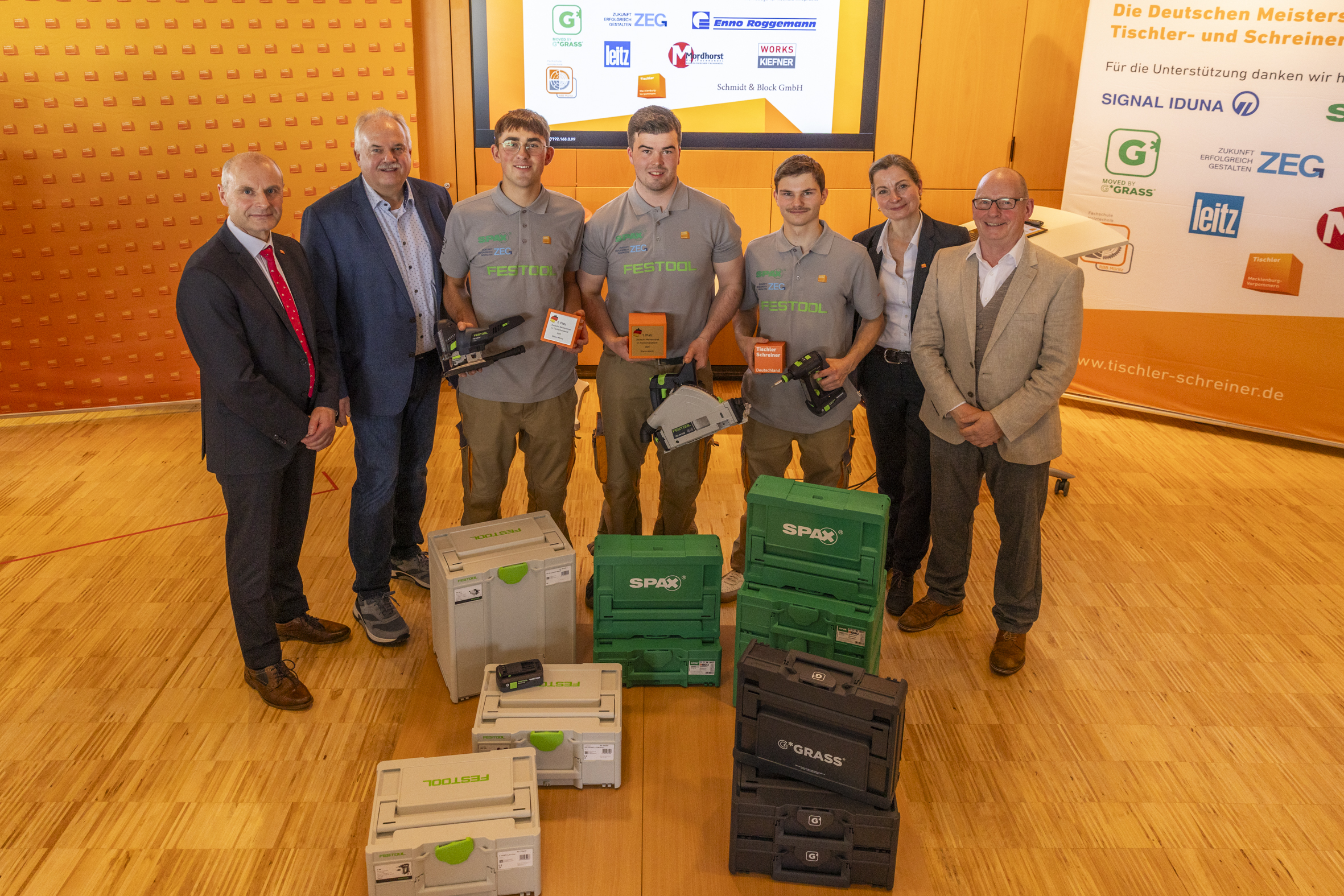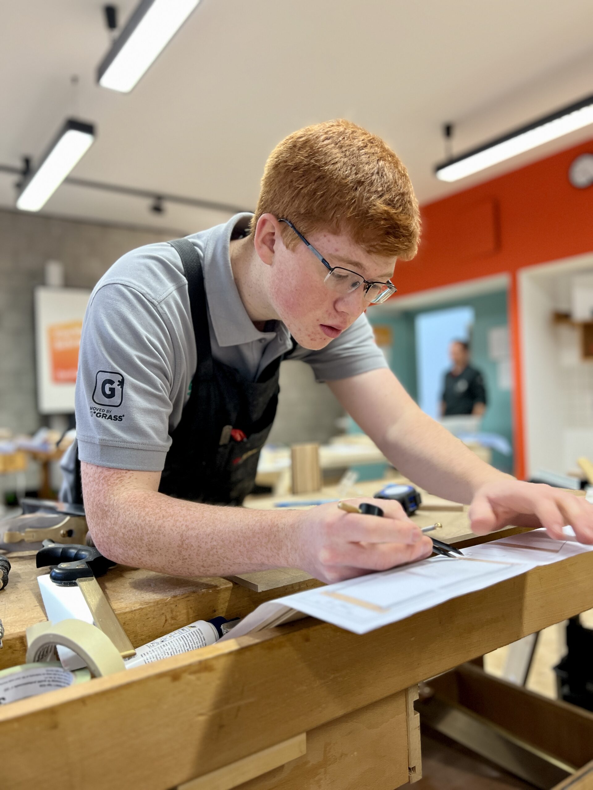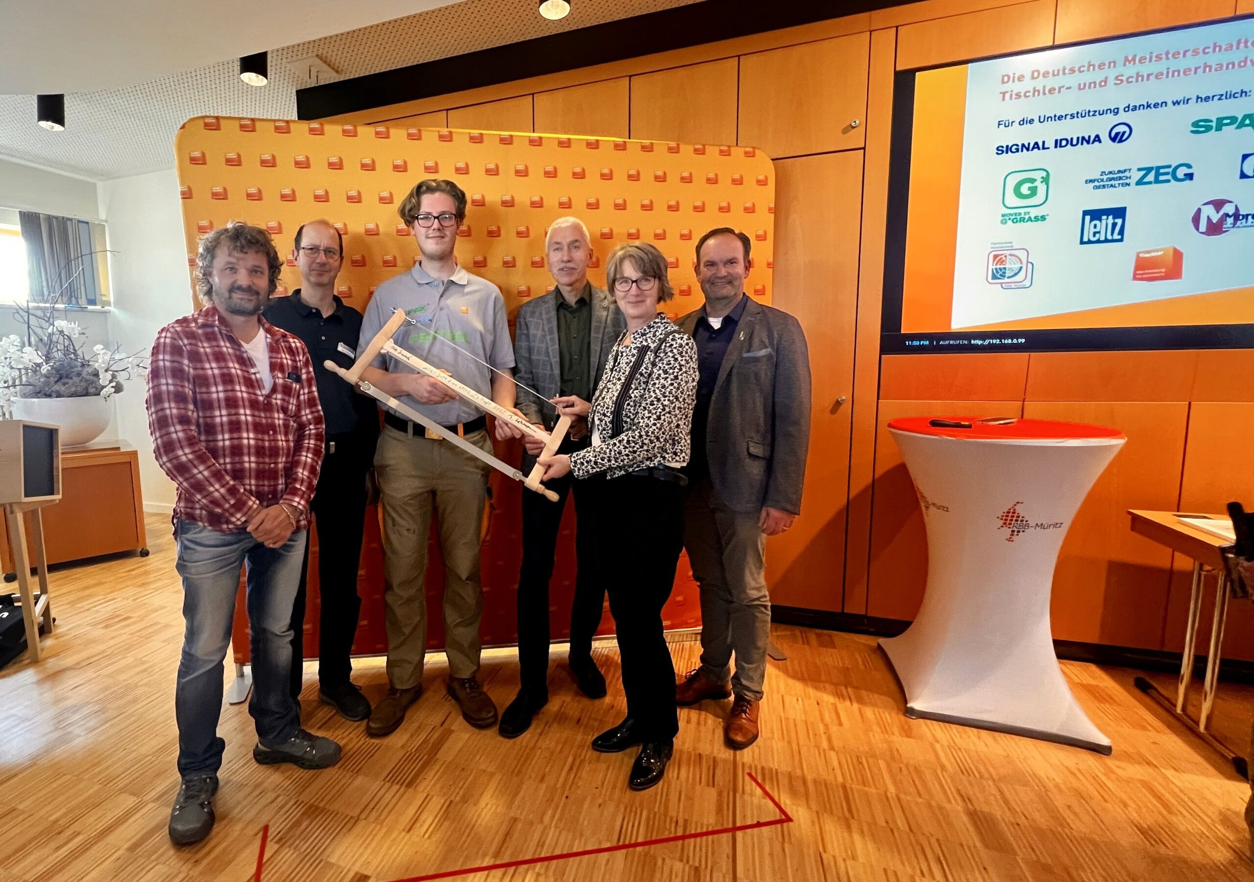 Was die jungen Fachkräfte leisteten, war in jeder Hinsicht beeindruckend: höchste Präzision, bemerkenswertes Zeitmanagement, enorme Konzentration und echtes handwerkliches Können. Alle Teilnehmer mussten eine „Schrägothek“ bauen, ein Designmöbelstück, das es in sich hatte. Genutzt werden kann es als eine Art Mini-Schreibtisch, aber eben mit einer besonderen Form.