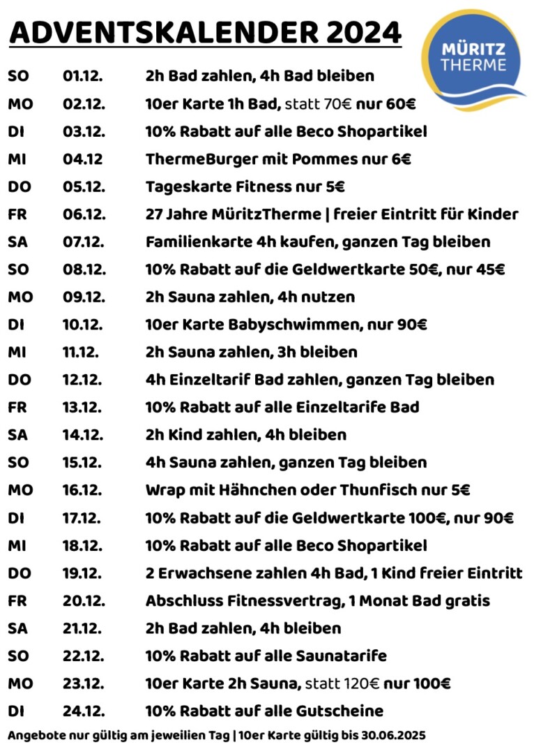Die Wartungsarbeiten sind beendet, heute öffnet die Müritz Therme in Röbel wieder in neuer Frische und mit neuem Logo. Ab morgen gibt es dann gleich ein Highlight – einen Adventskalender. 24 Tage lang können sich die Gäste der beliebten Therme über besondere Angebote freuen. So beispielsweise gleich am morgigen Sonntag, wenn man vier Stunden baden kann, aber nur zwei bezahlen muss. Am Nikolaustag, also am 6. Dezember, feiert die Therme zudem ihren 27. Geburtstag. Hinter dem Türchen Nummer sechs heißt es – freier Eintritt für alle Kinder. Außerdem finden sich hinter den Türchen zahlreiche Rabattangebote und Gutscheine, die sich auch sehr gut verschenken lassen.
