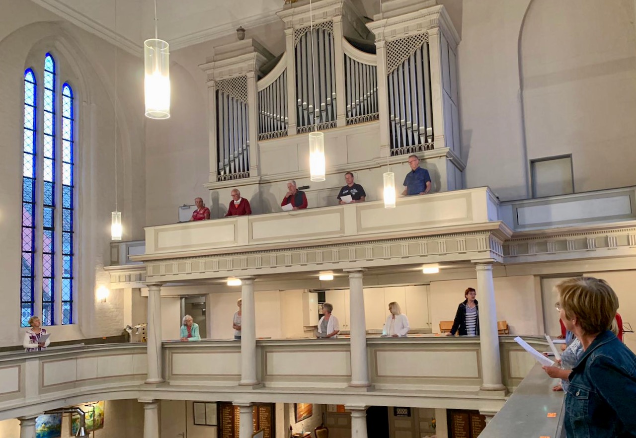 Bei Einhaltung der aktuell geltenden Abstandsregelungen kommt der sonst übliche Probenraum leider nicht in Frage. So sind die Sänger der Kirchgemeinde St. Marien in Waren dankbar, dass sie ihre Kirche zurzeit für die wöchentlichen Proben nutzen dürfen. Während das anfangs nur stimmgruppenweise im Wechsel möglich war, proben sie nunmehr bereits gemeinsam –allerdings fröhlich über das halbe Kirchenschiff verteilt.