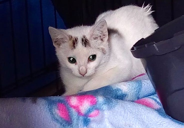 Anfang September gelang dann das Unvorstellbare. Mit Hilfe eines Anwohners, der den Katzen seit langem bei Dunkelheit etwas Fressbares zukommen lässt, konnten wir zehn Jungkatzen fangen. Unter ihnen eine weiße mit zwei dunklen Streifen auf dem Kopf.