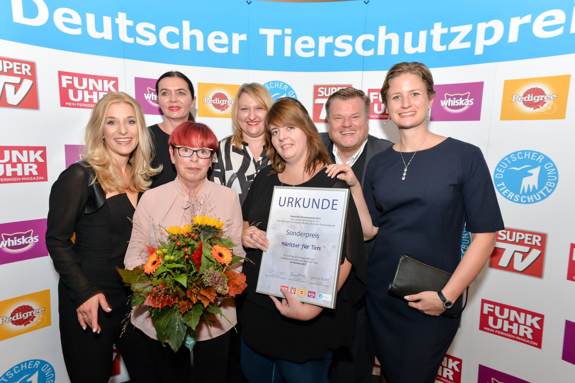 Bild unten: Strahlende Gesichter bei der Verleihung des Deutschen Tierschutzpreises 2017 (v.l.n.r.): Stefanie Hertel, Britta Wolff (Funk Uhr / Super TV), Bettina Priwitzer (Müritzer für Tiere), Stefanie Heidrich (Funk Uhr / Super TV), Sophie Gödecker (Müritzer für Tiere), Thomas Schröder (Deutscher Tierschutzbund), Johanna Müller (Whiskas / Pedigree)