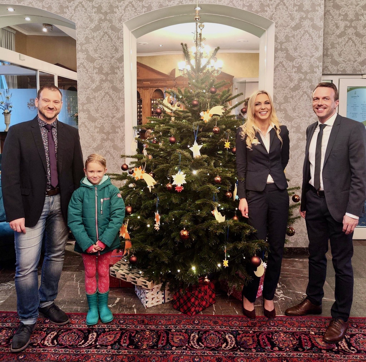 Foto oben: Daniela Lison und die beiden Hoteldirektoren Michael Elfert (links) und Mario Reincke haben die Spendenaktion für das Kinderhospiz in Greifswald gestartet. Auch Lara, Tochter von Michael Elfert, freut sich darüber.