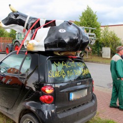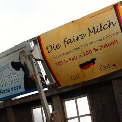 Wie prekär die Situation ist, machen Zahlen deutlich, die ein anderer Landwirt vor den Toren der Müritz-Milch nennt. „Wir zahlen für eine Monteurs-Stunde 55 Euro, wenn der Traktor mal streikt. Um diese Stunde bezahlen zu können, brauchen wir 200 Liter Milch. Das ist das Tagesgemelk von sieben Kühen.“ Und das alles, damit Supermärkte den Liter Tetrapack-Milch für 25 Cent im Sonderangebot bewerben können…