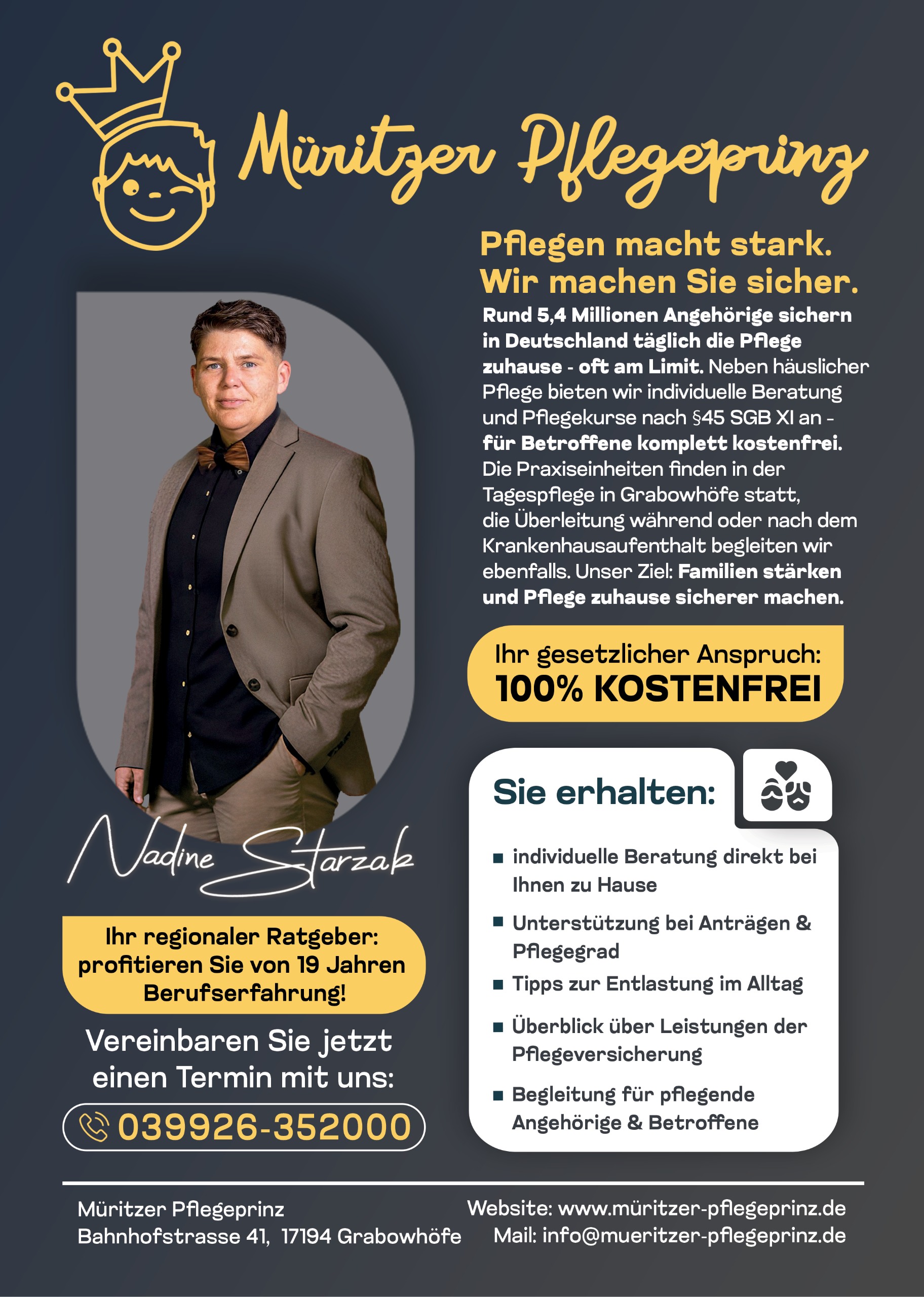 Die Leistungen innerhalb der Beratung nach § 45 SGB XI sind ein gesetzlicher Anspruch und für pflegende Familien zu 100 Prozent kostenfrei. Der „Müritzer Pflegeprinz“ begleitet Angehörige vorausschauend, erklärt ihnen bestehende Rechte, unterstützt mit praktischer Schulung und bietet Orientierung – ohne komplizierten Antrags-Wirrwarr, sondern entlang des realen Lebens zu Hause.